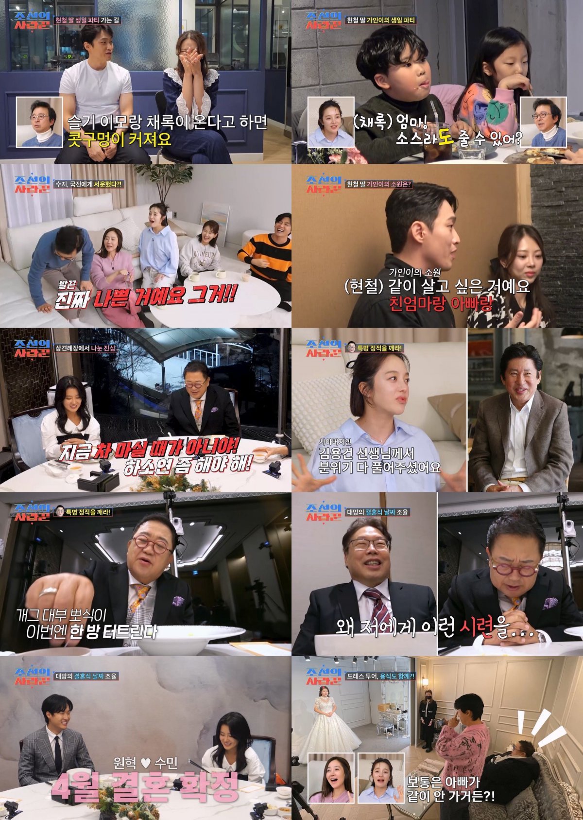 지난 15일 방송된 ‘조선의 사랑꾼’에서는 재혼 준비 중인 ‘돌싱커플’ 김슬기♥유현철이 각자의 자녀들인 홍채록, 유가인과 ‘완전체 4인 가족’으로 모였다. 가인이의 생일파티 장소로 향하던 중, 김슬기는 가인이가 꺼내는 친엄마 이야기도 자연스럽게 받아주며 화목한 분위기를 이어 나갔다. 제작진과의 인터뷰에서 유현철은 “슬기 이모랑 채록이 온다고 하면 가인이가 벌써 그렇게 좋아한다”며 진짜 가족이 되기에 앞서 친밀감을 쌓아가는 모습을 전했다. 지켜보던 강수지는 “나도 딸 비비아나랑 국진 씨가 같이 살게 되니까 굉장히 마음이 좋더라”며 ‘재혼 선배’의 훈훈한 고백을 전했다. 하지만 가인이의 생일파티가 시작되자, 엄마 김슬기의 관심을 뺏겼다고 느낀 채록이는 은근한 질투심을 보였다.