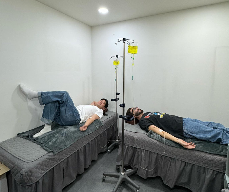 노홍철은 7일 자신의 인스타그램에 최자와 함께 병원에서 찍은 사진을 공개했다. 침대에 누운 두 사람은 침을 맞고 부항을 뜨며 건강관리에 집중한 모습으로 중장년의 공감을 자아냈다.