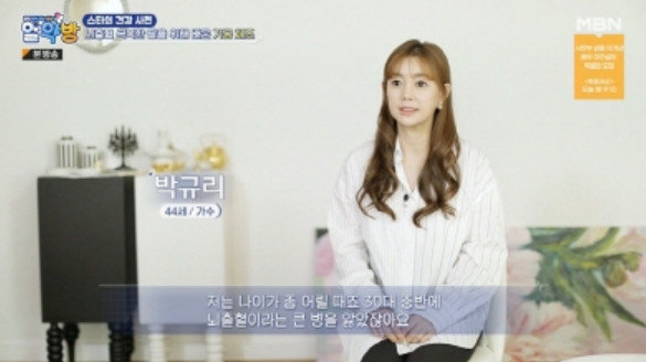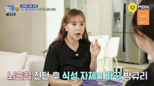 친정엄마는 “딸이 서른네 살에 뇌출혈이 와서, ‘왜 우리에게 이런 일이 왔지’라며 천당과 지옥을 오갔다”는 사연을 밝혔다. 직후 박규리는 “젊은 나이에 갑자기 뇌출혈이 와, 시신경이 손상돼 앞을 볼 수가 없었을 정도”라고 고백했다.