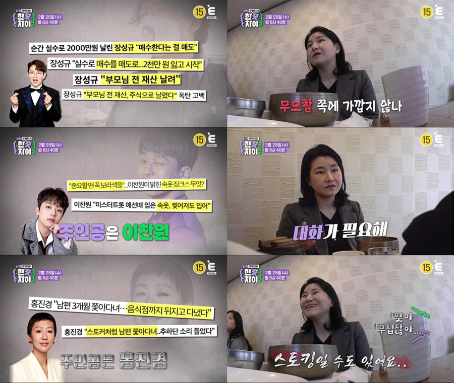 티캐스트 E채널 \'한 끗 차이: 사이코멘터리(이하 한끗차이)\' 제작진은 3MC 홍진경X장성규X이찬원의 실제 이야기를 마치 PD 지인의 이야기인 것처럼 속여 박지선 교수에게 상담하는 장면을 \'깜짝 카메라\'에 담았다. 3MC의 실제 일화임을 까맣게 몰랐던 박지선 교수는 날카로운 전문가적 분석과 \'진심 200%\' 폭풍 리액션으로 3MC의 숨겨진 심리를 분석해 \'빅재미\'를 선사했다.