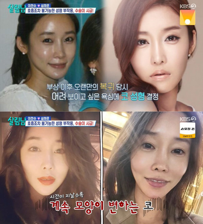 이어 심하은은 “모델 활동 당시, 다리가 부러져 쉬고 있었다. 무대에 다시 서기 위해 이미지를 조금 바꿔보려고 했던 욕심이 잘못된 선택이었다”라며 “수술 후 바로 염증이 생겼다. 3개월 동안 코를 3번 재수술 했다. 그러면서 무리가 왔나 보다. 마지막에는 흉살이 보일 정도였다. 사진을 보면 결혼하고 나서 그때그때 마다 코가 바뀌어 있었다. 코가 건조하고 추운 날씨가 되면 방금 코 수술한 것처럼 아프다”라고 말했다.