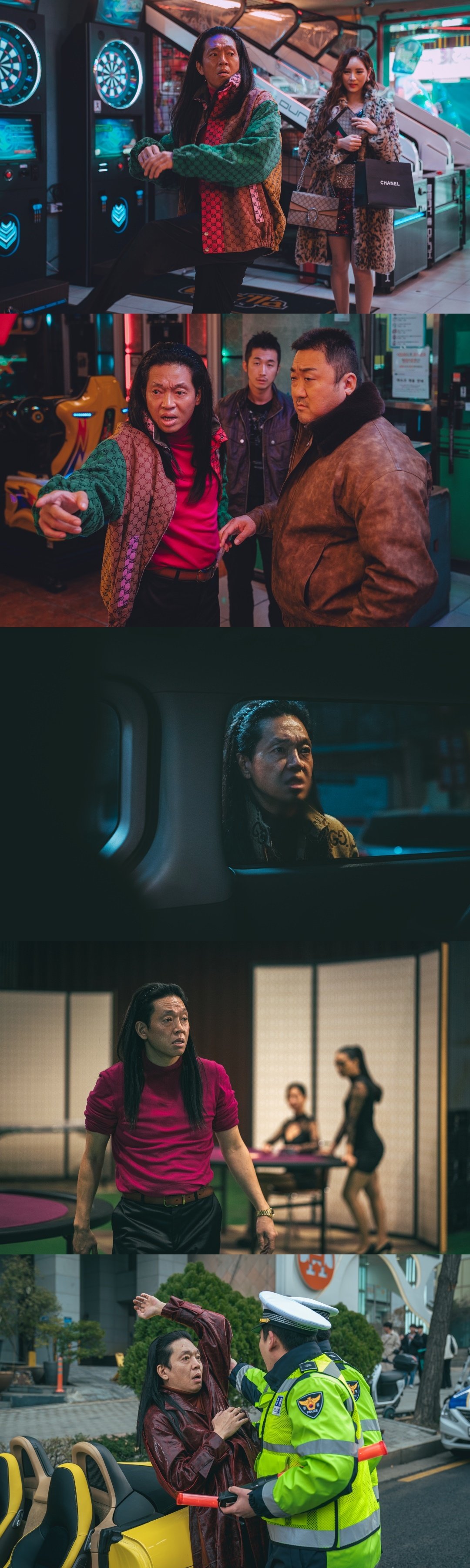 '범죄도시' 시리즈의 히든카드 ‘장이수’(박지환)가 다시 돌아온다. '범죄도시3'의 쿠키 영상에 깜짝 등장하면서 시리즈 팬들을 열광케 했던 ‘장이수’는 공개된 캐릭터 스틸을 통해 가장 파격적으로 컴백한다. 시리즈의 시작을 알렸던 '범죄도시'에서 이수파 두목으로 처음 등장해 불법 도박장, 흥신소 등 시리즈를 거치며 다양한 사업을 이어갔으나 매번 ‘마석도’(마동석)의 방해를 받았던 ‘장이수’. '범죄도시4' 에서는 불법 오락실 회장님으로 화려하게 복귀한다. 공개된 스틸 속 ‘장이수’의 명품 의상과 장발 스타일링만으로도 시리즈 사상 가장 강렬한 활약을 예고한다.