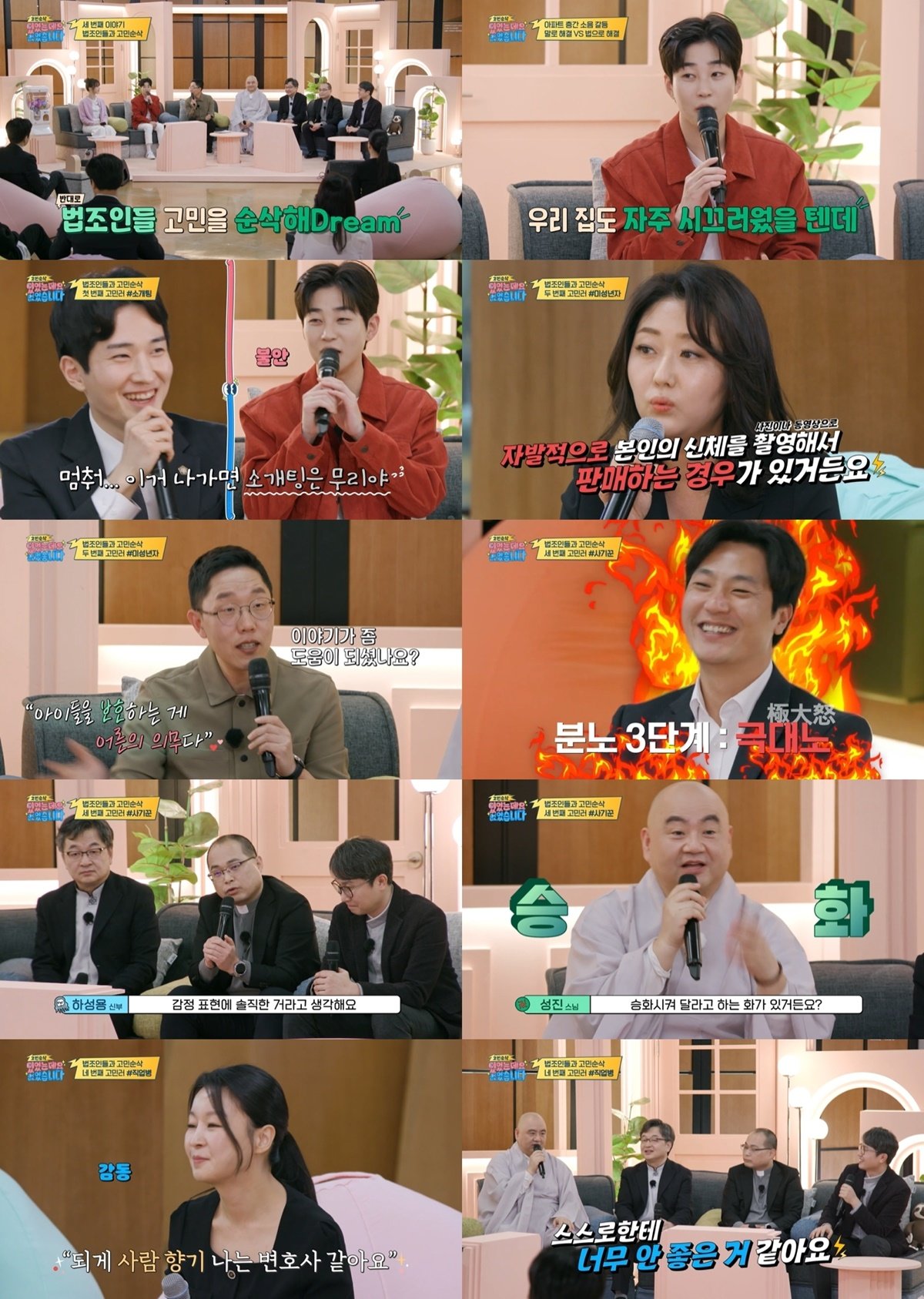 지난 26일 방송된 MBC에브리원 ‘고민순삭 있었는데요 없었습니다’에서는 세 번째 출장 상담소를 열어 법조인들의 고민을 나누는 시간을 가졌다. 개신교 김진 목사, 불교 성진 스님, 원불교 박세웅 교무, 천주교 하성용 신부 등 4인 성직자는 법조인들의 고민 상담은 물론, 다양한 사회 범죄와 문제들에 대해 의견을 나누고 해결책에 대해 고민하는 의미 있는 시간을 가졌다.