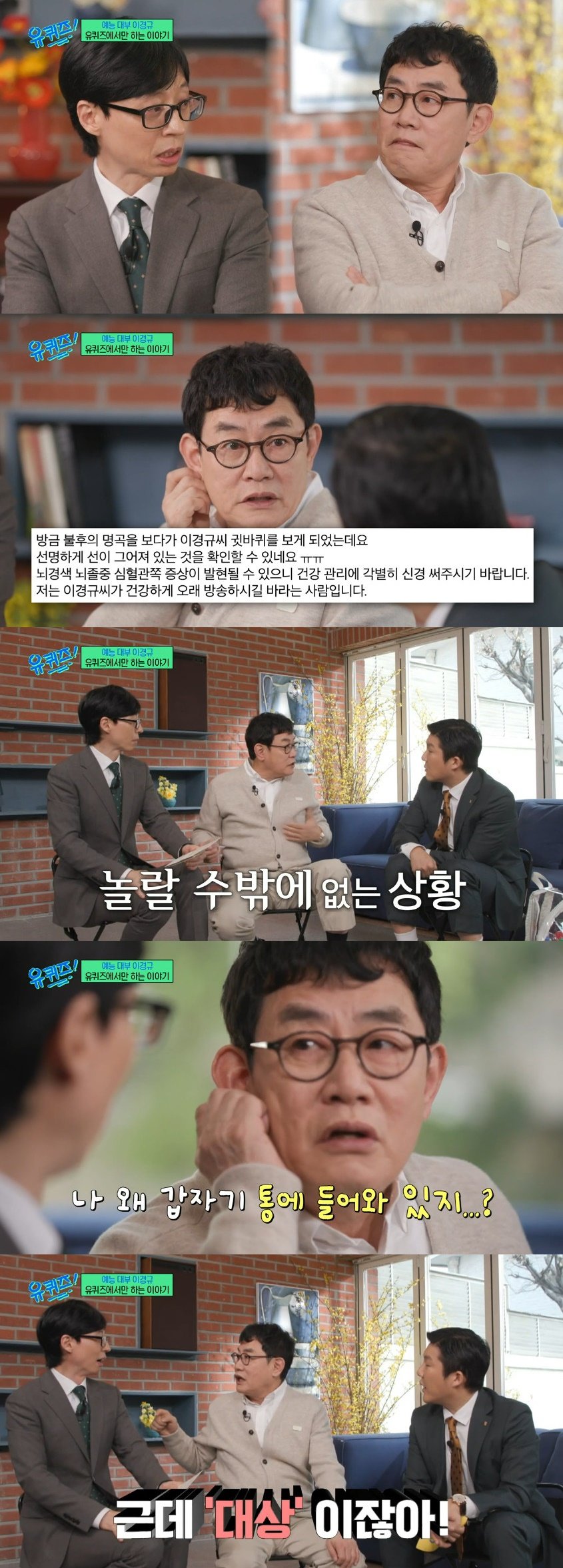 그러면서 이경규는 “그래서 보고 거울을 봤는데, 주름이 있더라. 그래서 나는 난리가 났다. 그래서 아는 병원에 가서 의사 선생님을 만났다. 그래서 MRI 검사까지 했다. 근데 멀쩡하더라. 아무 이상이 없었다”라고 현재 건강에 아무 이상이 없다고 전했다.