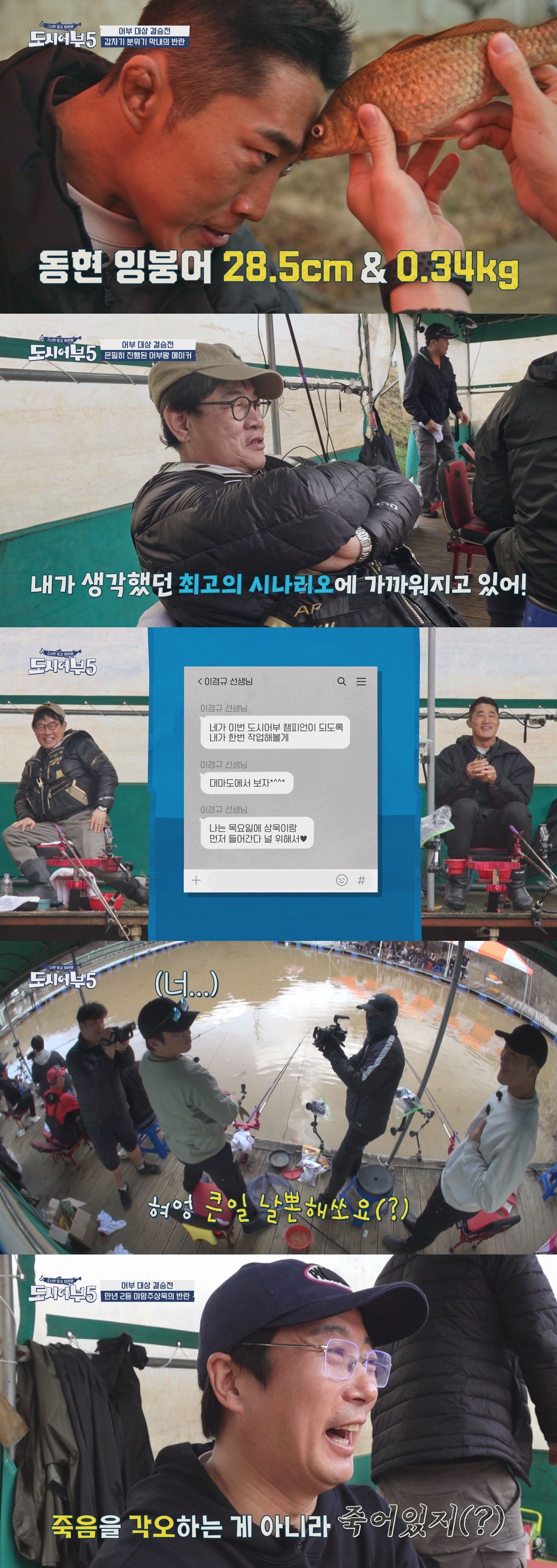이날 시즌5의 결승전인 붕어 민물 낚시에서는 어부 대상의 역전을 노리던 김동현이 욕심을 드러낸다. 우승에 야망을 품은 김동현은 붕어에 찌 영점을 조준하는 신개념 낚시법으로 첫 히트를 차지한다. 김동현의 낚시를 지켜보던 주상욱은 “같이 낚시 못 하겠다”라며 김동현의 낚시법에 경악을 감추지 못한다. 이어 낚시를 시작한 지 약 2시간 만에 붕어가 등장하자, 김진우 프로는 “손잡이를 잡고 가만히 있어”라며 적극적인 코칭에 나서지만 김동현은 “손잡이가 어디예요”라며 어복에 비해 얕은 낚시 상식을 드러낸다. 이에 이경규는 “대회 박살 났다. 퇴장시켜”라며 김동현의 결승전 퇴장을 제안해 웃음을 선사했다는 후문이다. 과연 김동현은 영점 조준 낚시로 역전극에 성공할 수 있을지 궁금증을 자아낸다.