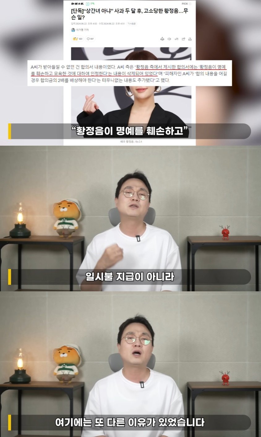 또 “황정음은 남편에게 9억원이 넘는 거액을 빌려줬다. 황정음 씨의 개인 법인을 통해 9억원이 넘는 금액을 빌려줬다. 문제는 이혼 과정에서 이 돈을 돌려받을 길이 불투명해진 거였다. 황정음은 수차례 돈을 돌려달라고 했지만 돌려받지 못했고, 결국 남편을 상대로 9억원이 넘는 돈을 돌려달라는 민사 소송을 제기하게 됐다”라고 이유를 설명했다.