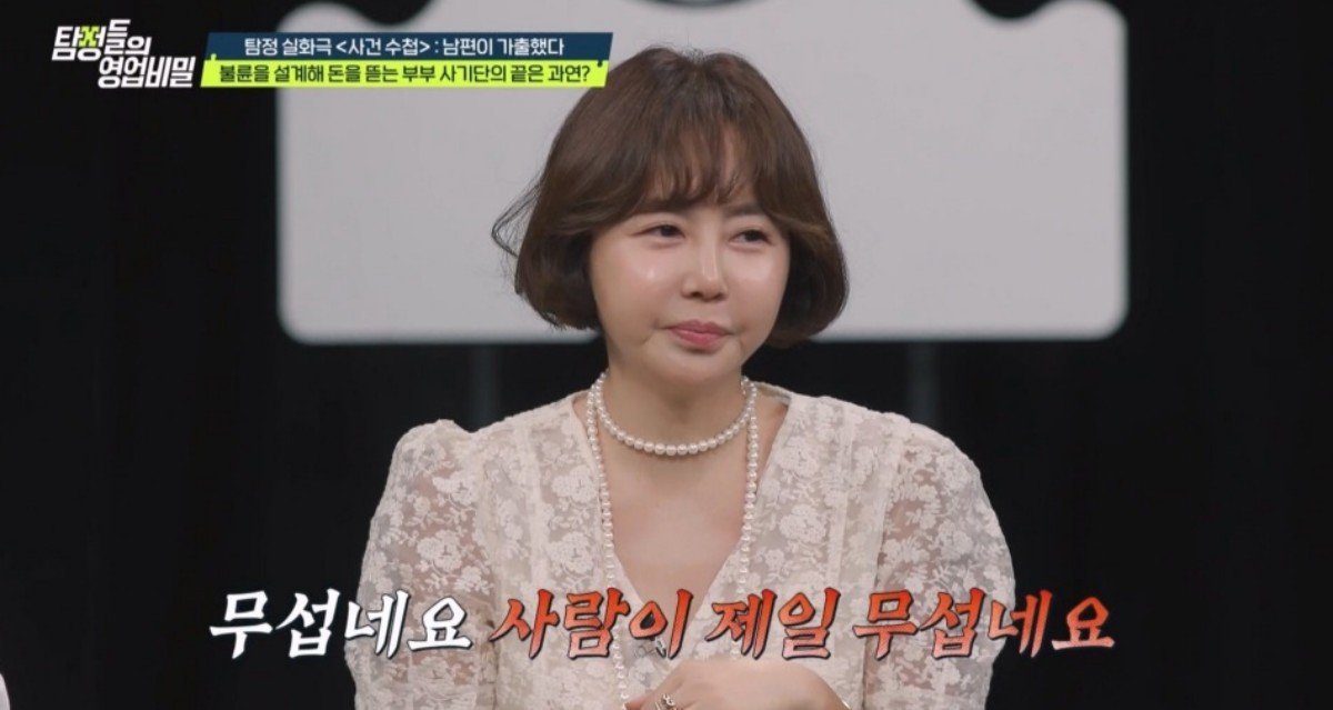 이후 탐정은 불륜녀가 진짜 남편과 함께 노래방을 운영하며 도우미로 나간다는 사실을 알아냈다. 남성태 변호사는 "남편 사업이 망해서 아내를 노래방 도우미로 일하게 한 경우가 있었다. 그런데 \'다른 집 와이프도 도우미로 돈 버는데 뭐가 잘못됐느냐\'고 적반하장으로 나왔었다"고 실제 경험을 회상했다. 탐정은 해당 업소에 잠입해 특수 카메라로 모든 정황 증거를 남겼고, 결국 불륜녀와 그 남편 부부는 동반 체포를 당했다. 데프콘은 "옥바라지는 누가 하냐"고 되물어 웃음을 선사했다. 상상도 못할 충격 실화에 황혜영은 "막장 드라마도 저런 드라마가 없을 것 같다"며 혀를 내둘렀다. 남성태 변호사는 이어 "이런 일이 빈번하다. 사건화된 사례 중에 남편이 빚쟁이에게 아내와의 성관계를 빌미로 빚을 탕감시킨 일도 있었다"고 전해 놀라움을 자아냈다. 황혜영은 "사람이 제일 무섭다"며 경악했다.