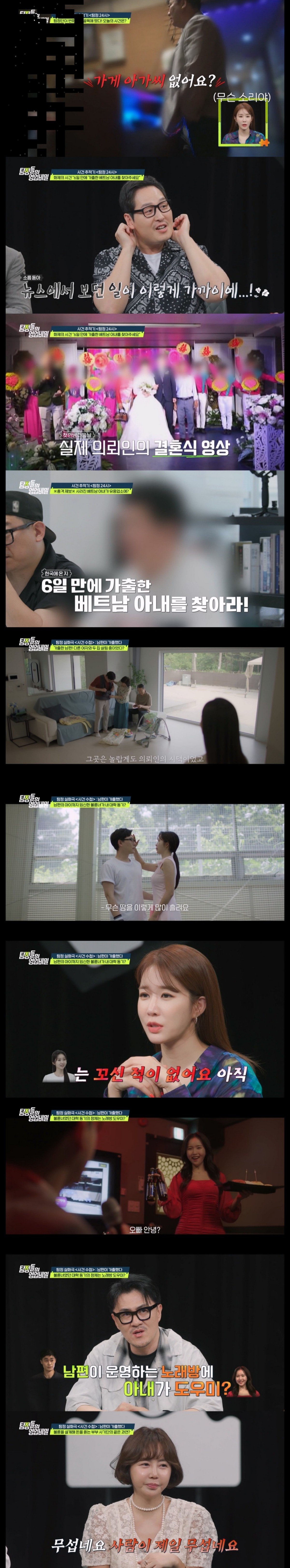 지난 22일 ‘탐정들의 영업비밀’에서는 \'갈매기 탐정단\'이 인터넷을 달구며 기사화된 사건의 주인공 \'결혼 6일 만에 도망간 베트남 아내\'의 행적을 뒤쫓는다. 갈매기 탐정단은 해당 사건이 기사화되기 전부터 이 아내를 쫓고 있던 것으로 알려져 놀라움을 자아냈다. 의뢰인은 중개업체를 통해 베트남에서 아내와 만나 결혼했다. 하지만 입국 전 아내의 비자 문제 등을 사유로 7개월간 떨어져 있어야 했다. 기다림의 시간 동안 의뢰인은 주택청약에 당첨됐고, 아내와 같이 살 생각에 옷가지를 준비하며 설렘을 감추지 못했다. 하지만 7개월 만에 만난 아내는 남편과 대화조차 거부하다 한국에 온 지 6일 만에 가출해 버렸다. 의뢰인은 "제가 올 때마다 시체처럼 누워있었다. 휴대폰만 들여다봤다”며 회상했다.