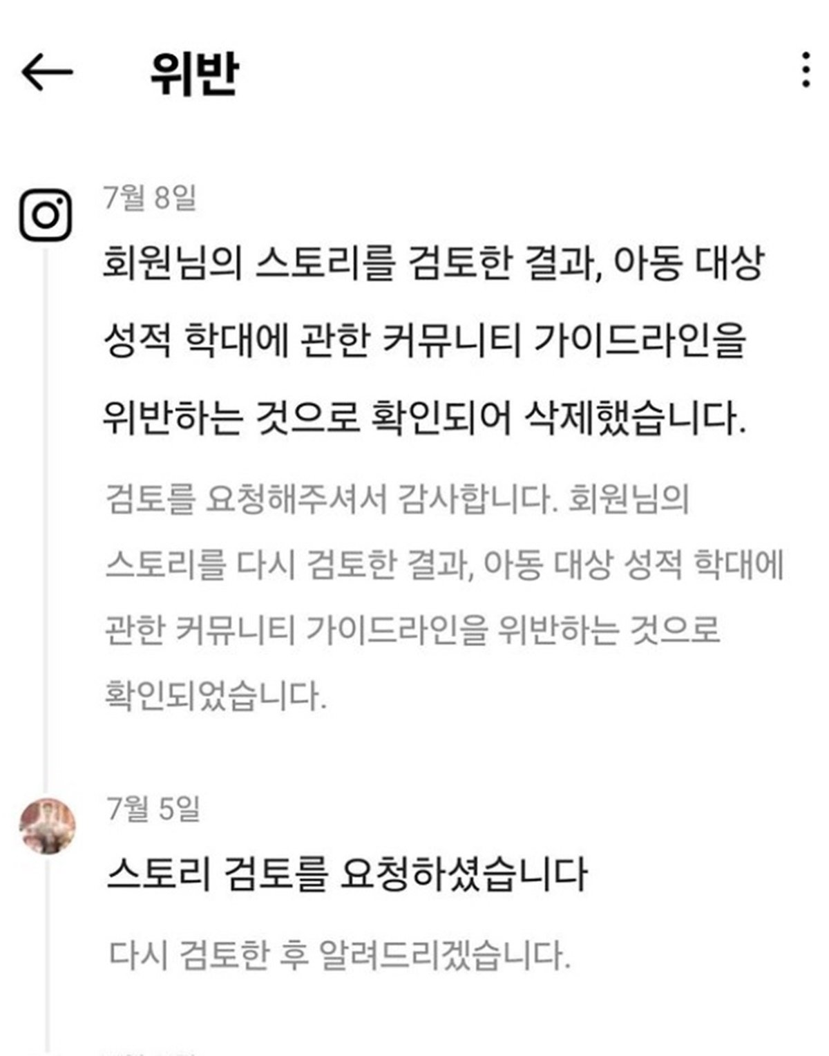 글과 함께 황신영이 공개한 사진에는 ‘회원님의 스토리를 검토한 결과, 아동 대상 성적 학대에 관한 커뮤니티 가이드라인을 위반하는 것으로 확인되서 삭제했습니다’라고 적혀있다.