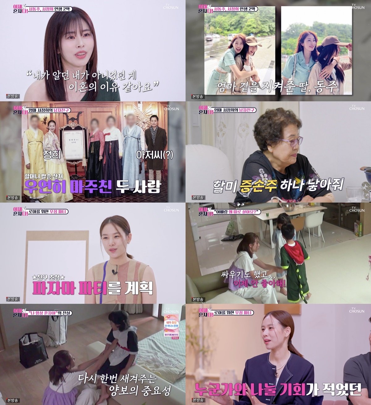 지난 30일(화) 오후 10시에 방송된 TV CHOSUN 신규 관찰 예능 파일럿 프로그램 ‘이제 혼자다’ 4회에서는 서동주가 엄마 서정희와 외할머니, 3대가 함께하는 인생 2막과 딸 로아를 위해 파자마 파티를 개최한 조윤희의 모습이 그려졌다. 이날 방송 시청률은 분당 최고 3.7%, 평균 3.4%(닐슨코리아, 전국 기준)를 기록하며 종편과 케이블을 포함한 화요일 전체 프로그램 1위에 등극했다.