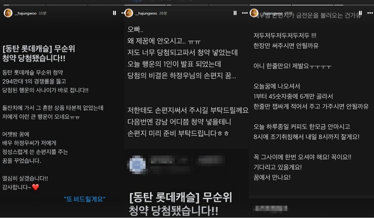 이후 하정우에게 푸념의 글이 쏟아졌다. 여성의 추정되는 또 다른 누리꾼은 “오빠 왜 제 꿈에 안 오시고. 저도 너무 당첨되고 싶어 청약 넣었는데. 오늘 행운의 1인이 발표되었는데 당첨의 비결은 하정우 님의 손 편지 꿈. 저한테도 손 편지 써서 주시길 부탁드릴게요. 다음에는 강남 어디쯤 청약 넣을 테니 손 편지 미리 준비 부탁드립니다”라고 썼다. 하정우는 이 글도 캡처해 올렸다.