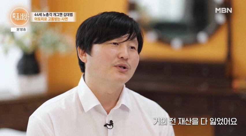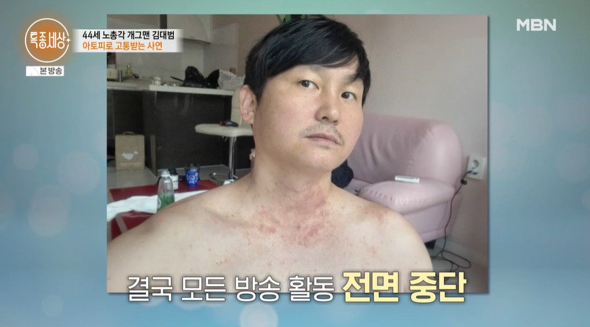 김대범은 아토피 때문에 틈틈이 보습 크림을 발라줘야 한다고. 그는 가려워서 긁다가 생긴 흉터 자국들을 공개했다. 그러면서 “아토피가 정말 심했다. 얼굴까지 다 덮은 상태였다. 자괴감이 들고 대인기피증이 생긴다. 아무것도 하기 싫었다. 스스로 은둔 생활을 2년 넘게 했다”고 털어놨다.