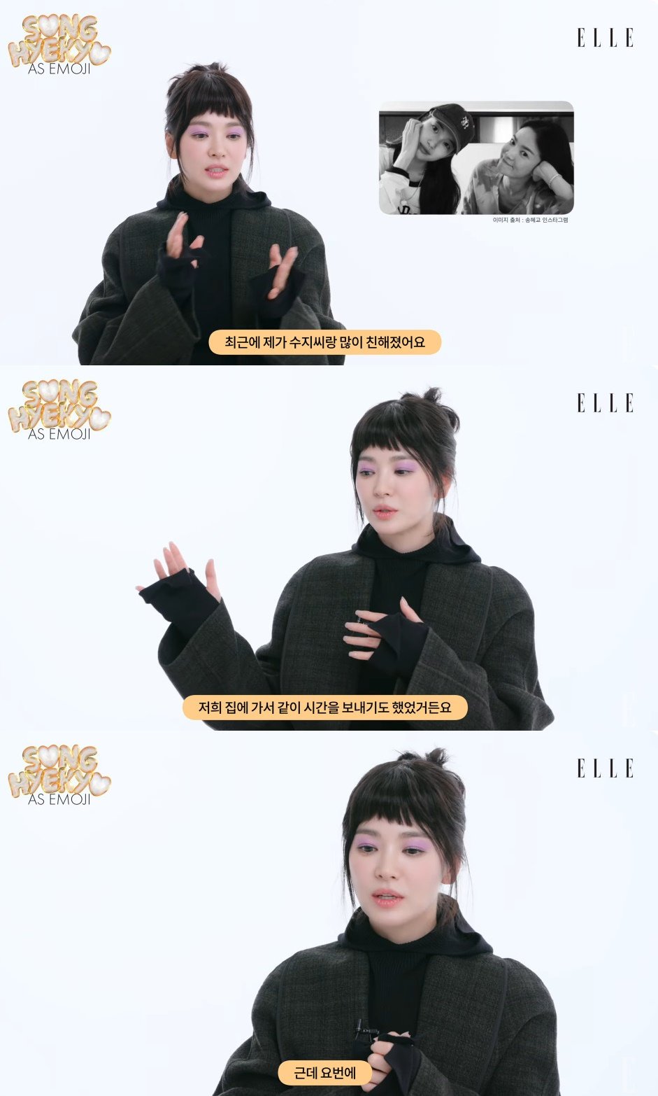 공개된 영상에서 송혜교는 ‘최근 TMI?’라는 질문에 “최근에 제가 수지씨랑 많이 친해졌다. 그래서 저번에 ‘청룡시리즈어워즈’ 핸드프린팅 행사 끝나고도 저희 집에 가서 같이 시간을 보내기도 헀었다”라고 설명했다.