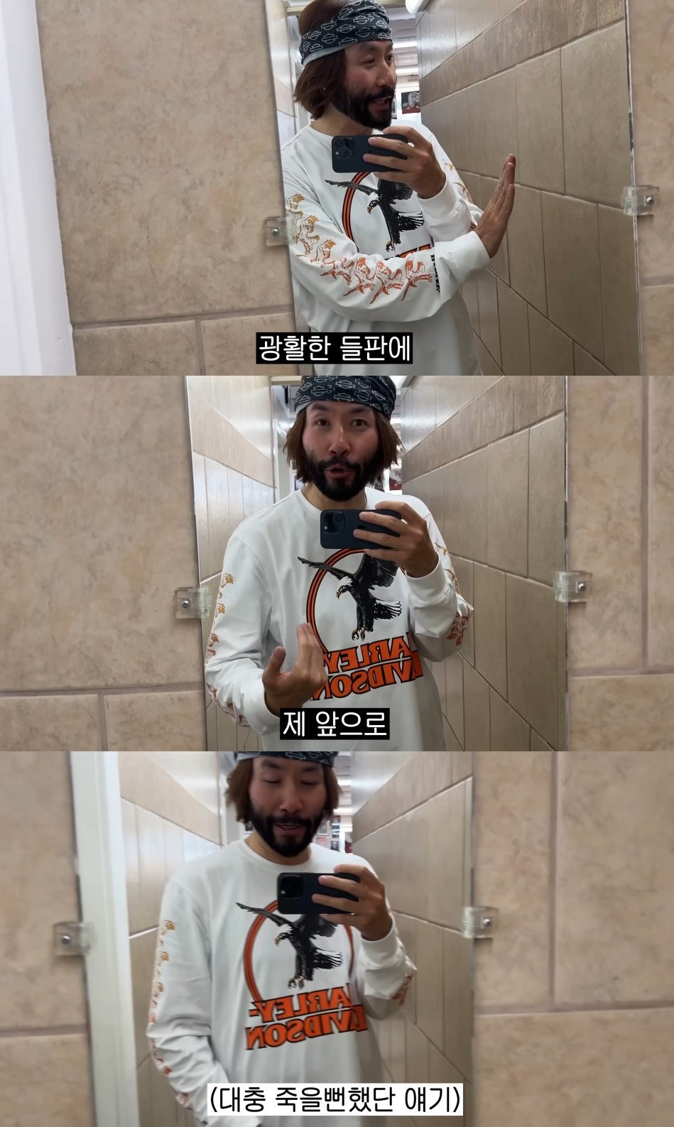 계속해서 바이크 투어 중이던 노홍철은 한 휴게소 화장실에 들러 거울로 외모를 살피던 중 “광활한 들판에 노루 한 마리가 미친 듯이 뛰더라”라고 운을 뗐다.
