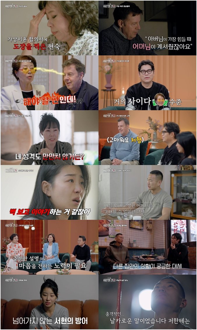 다음 날, 로버트 할리는 데뷔 60년 차 배우이자 절친한 방송계 선배인 선우용여를 만났다. “5년 전 ‘그 일’로 온 세상이 나를 외면했을 때 먼저 손 내밀어주신 고마운 분”이라고 선우용여와의 친분을 밝힌 할리는 잠시 후, 한 식당에서 선우용여와 재회했다. 선우용여는 반가워하며 “아내는 잘 지내냐?”고 물었고, 할리는 “사실 이혼을 하게 됐다”고 고백했다. 깜짝 놀란 선우용여는 “살면서 안 싸우는 부부는 없다”며 그를 다독였고, 할리는 “아내가 저를 대하는 방식에 불만이 있다”고 하소연했다. 선우용여는 “가장 대우를 받고 싶어 하는 것 같은데, 집에선 가장 노릇 하지 말라”고 ‘사이다’ 발언을 투척했다. ‘급’ 공손 모드가 된 할리는 묵묵히 조언을 들었으며, 이 모습을 지켜보던 스튜디오 출연진들은 “최고의 솔루션이다!”, “전문 상담가 포스가 있으시다”라며 선우용여를 ‘리스펙’ 했다. 같은 시각, 명현숙도 오랜만에 친언니를 만나 (가상) 이혼 소식을 알렸다. 명현숙의 친언니는 “(할리가) 우리 둘 다 중학생일 때, 옆집에 살던 오빠였는데 어느 날, 너와 결혼한다고 해서 놀랐었지”라고 옛 추억을 떠올린 뒤, “이혼이 우리 가족의 일은 아니라고 생각했는데, 신중히 고민하고 잘 결정하길 바란다”고 조언했다. 명현숙의 ‘이혼 결심’에 변화가 생길 수 있을지 관심이 쏠리는 가운데. 이번엔 고부 갈등으로 부부 상담까지 받고 온 정대세-명서현의 위태로운 일상이 공개됐다.
