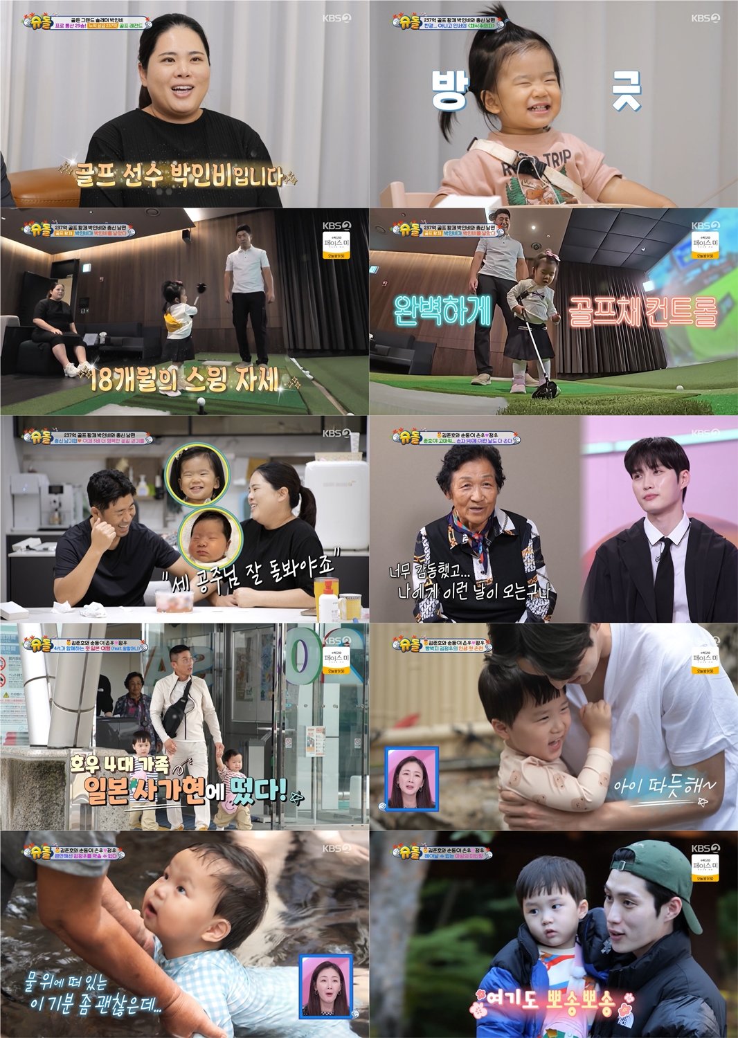 지난 13일(수) 방송된 ‘슈돌’ 548회는 ‘날 닮은 굿 베이비’ 편으로 3MC 최지우, 안영미, 박수홍과 슈퍼맨 박인비, 김준호가 함께했다. 이중 박인비의 딸 18개월 인서가 눈웃음과 골프 실력으로 첫 등장부터 보는 이들을 매력으로 마음을 녹였다. 또한 김준호, 은우, 정우 삼부자는 왕할머니, 할아버지와 일본으로 첫 해외여행을 떠나 온천을 만끽했다.