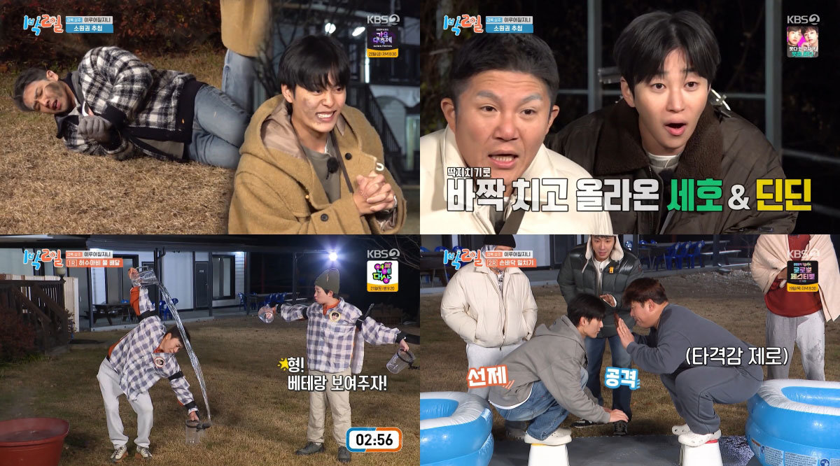 소원권을 획득한 조세호와 딘딘은 각각 팀을 나눠 3:3 팀전으로 저녁식사 복불복을 진행했다. 팀원 선정 결과 ‘1박 2일 시즌4’ 원년 멤버 팀(김종민·문세윤·딘딘)과 뉴페이스 팀(조세호·이준·유선호)의 대결 구도가 됐다.