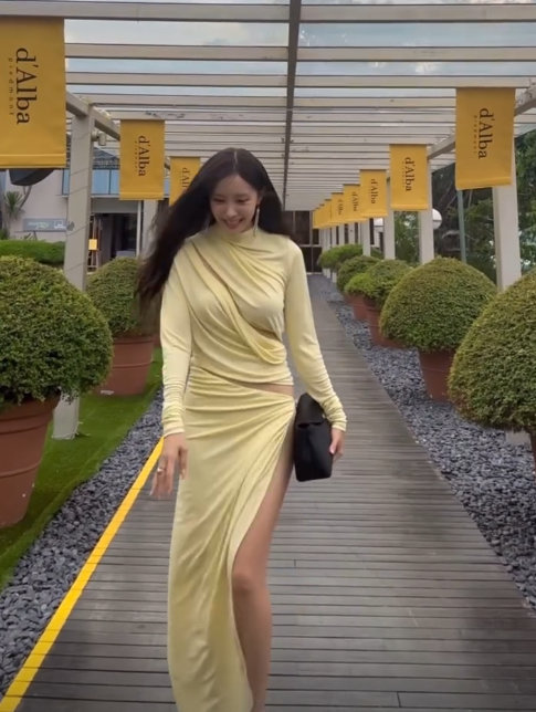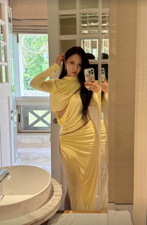 효민은 16일 자신의 인스타그램을 통해 한 브랜드의 행사장에서 찍은 사진과 영상을 공개했다. 사진 속 그는 브랜드 컬러에 맞춰 노란색 롱 드레스를 입고 우아한 분위기를 연출했다.