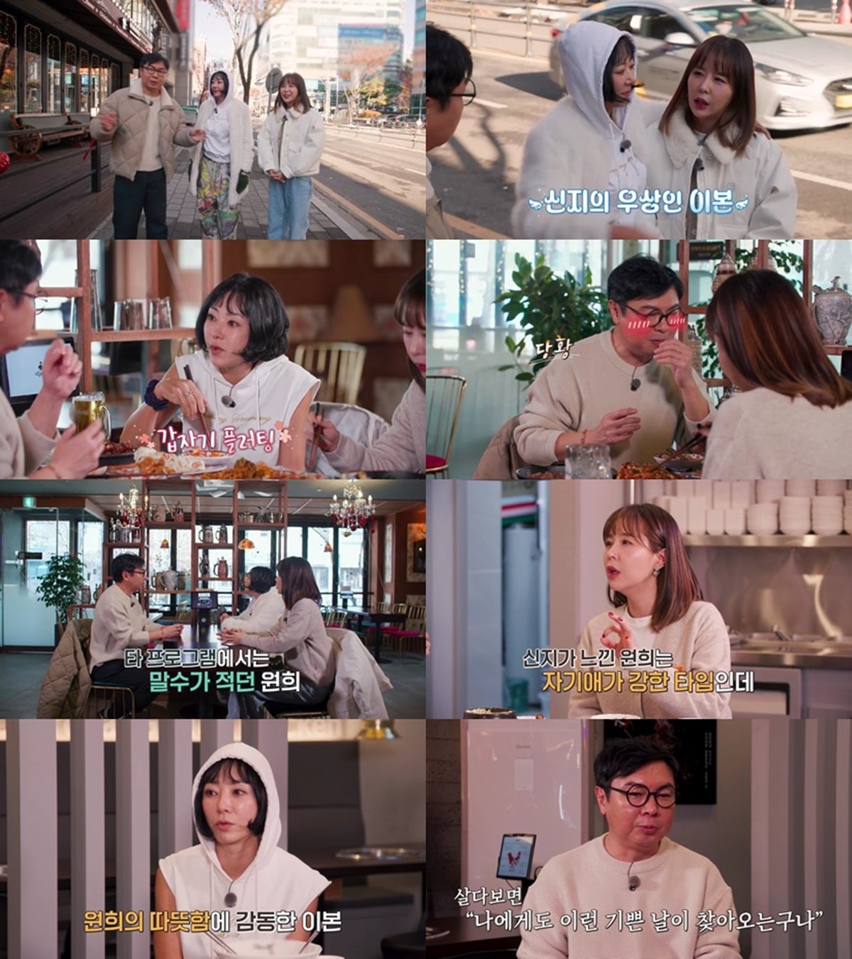 신지는 “데뷔 26년 차, 여러 음식 프로그램을 나왔지만 오빠는 출연자를 가장 편하게 해주시는 것 같다”면서, “진정성과 따뜻한 매력을 지녔는데 자기애가 강해 스스로에 대한 기준이 높아 연애를 어려워 하시는 것 같다”며 응원의 메시지를 전한다. 이야기를 듣던 임원희는 “이 프로그램을 통해 좋은 사람과 좋은 밥 세 끼를 먹으며 느껴지는 행복에 감사하고 있다. 오늘도 두 분의 좋은 이야기에 긍정적 에너지를 받아간다”고 화답해 훈훈한 분위기를 만들어낸다.