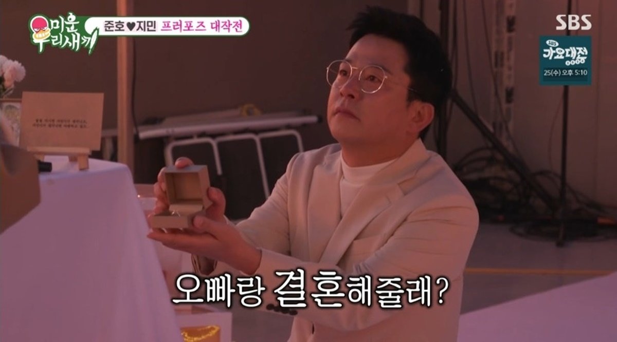 김지민 앞에 등장하기 전, 이상민이 “아직 울면 안된다”며 진정시켰지만, 김준호는 북받치는 감정을 주체하지 못하고 울음을 터트렸다. 영상을 보던 김지민도 눈시울이 붉어졌다. 영상이 끝난 뒤 김준호는 ‘서시’를 부르며 등장했고, “지민아, 진짜 모자라고 부족한 오빠를 사랑해줘서 고맙고, 앞으로 아프지 말고 우리 오랫동안 사랑하자”라며 “오빠랑 결혼해줄래?”라고 무릎을 꿇고 반지를 건넸다. 이에 눈물을 흘리던 김지민은 갑작스럽다고 말하면서도 “껴줘”라며 김준호의 프러포즈를 받아들여 그의 프러포즈는 대성공으로 마무리됐다.