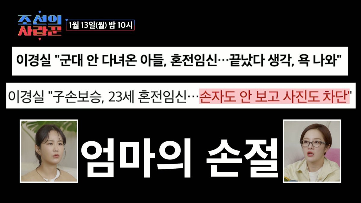 13일 ‘조선의 사랑꾼’에서는 코미디언 이경실과 이경실의 아들인 배우 손보승이 모자 관계를 끊었던 그 순간의 심경을 밝힌다. 2022년 손보승은 혼전 임신으로 23살 어린 나이에 한 아이의 아빠가 됐다. 그리고 이 소식을 들은 이경실은 과거 아들과의 ‘손절’을 선언해 세간의 관심을 한몸에 받은 바 있다.