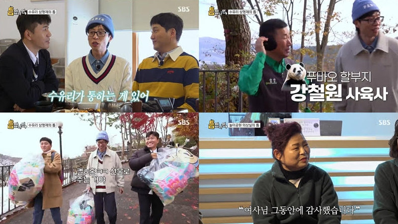 세 사람은 후련한 마음으로 식사 시간을 가졌다. 김대명은 캐스트들이 알아주는 20년 김치찌개 맛집으로 유재석, 김종민을 감동시켰다. 이후 ‘수유리 삼총사’가 향한 곳은 다름 아닌 판다 월드였다. 세 사람은 깜짝 등장한 강철원 사육사와 함께 푸바오 가족들과 틈새 힐링 타임을 가졌다.