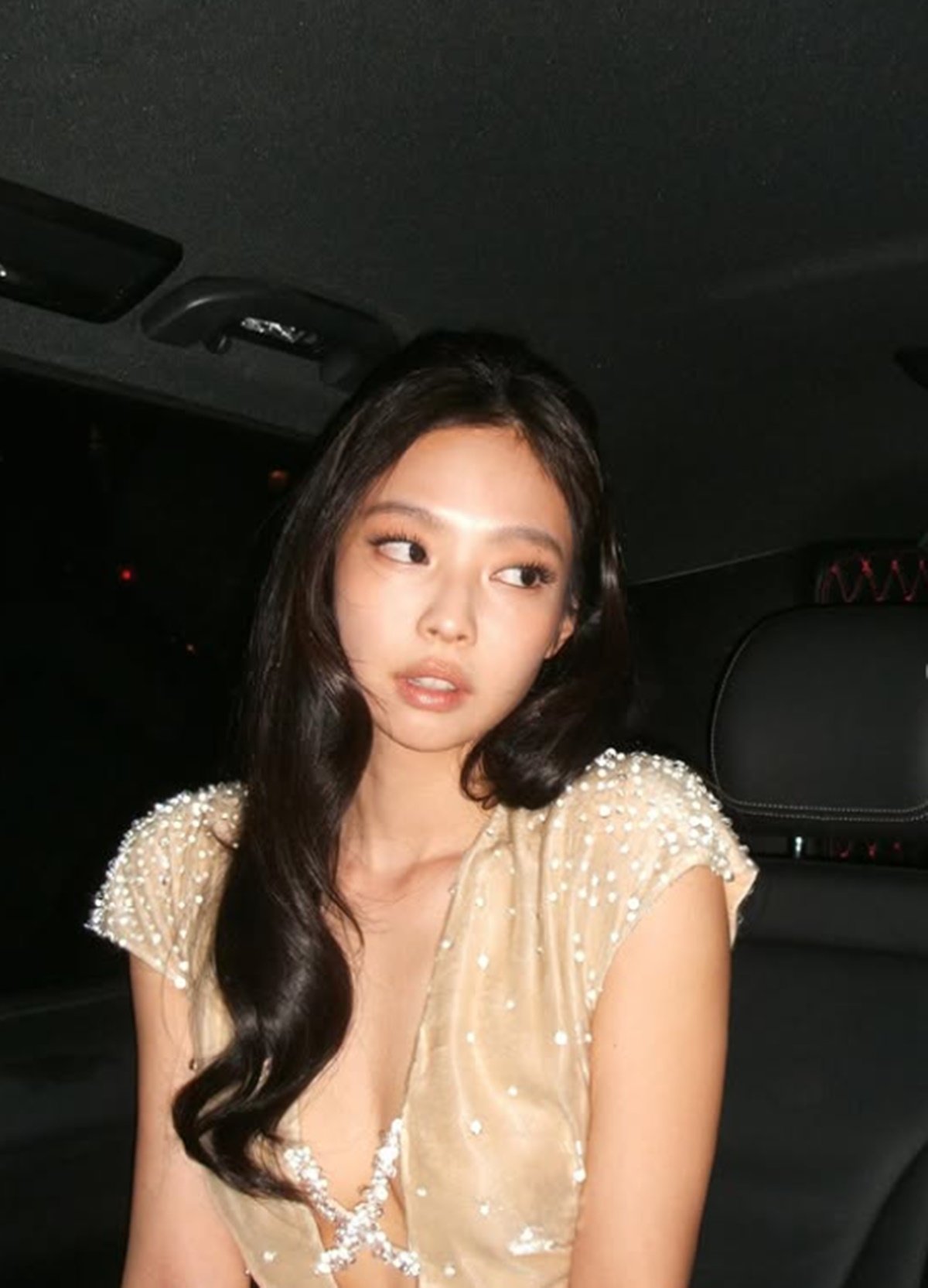 공개된 사진 속 제니는 스킨톤에 비즈가 가득한 드레스를 입고 있다.