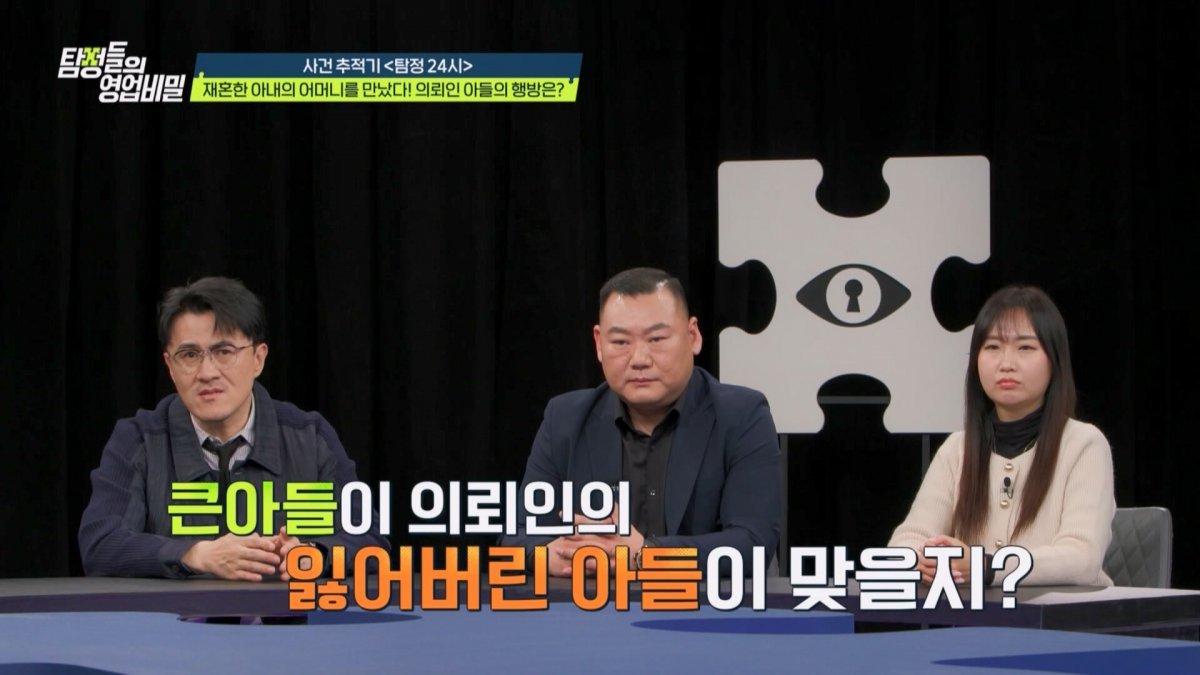지난 10일 ‘탐정들의 영업비밀’에서는 ‘백호 탐정단’이 25년 전 시댁의 이혼 강요로 낳자마자 헤어지게 된 아들을 찾는다는 의뢰인을 위해 추적을 계속한다. 백호 탐정단은 전남편이 의뢰인과 헤어진 뒤 재혼했지만 또 이혼했으며, 두 아들이 있다는 사실을 알고 있었다. 전남편의 큰아들은 의뢰인이 잃어버린 아들과 비슷한 나이대로 추정돼, 의뢰인의 아들일 수도 있는 상황이었다.