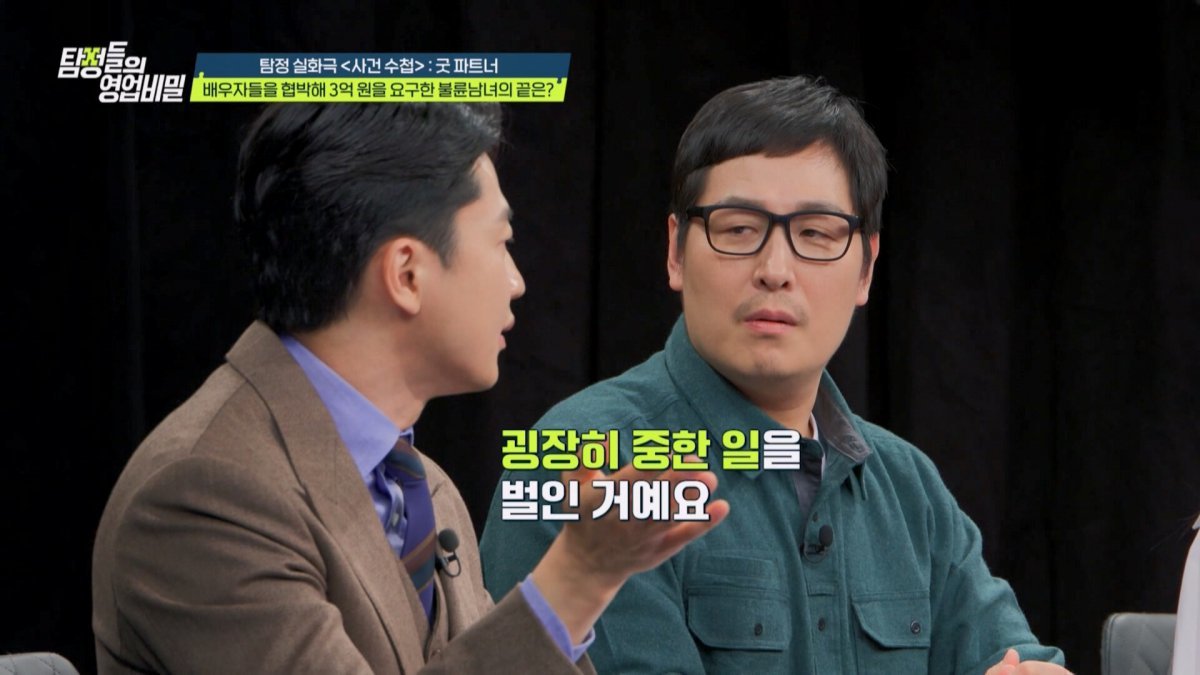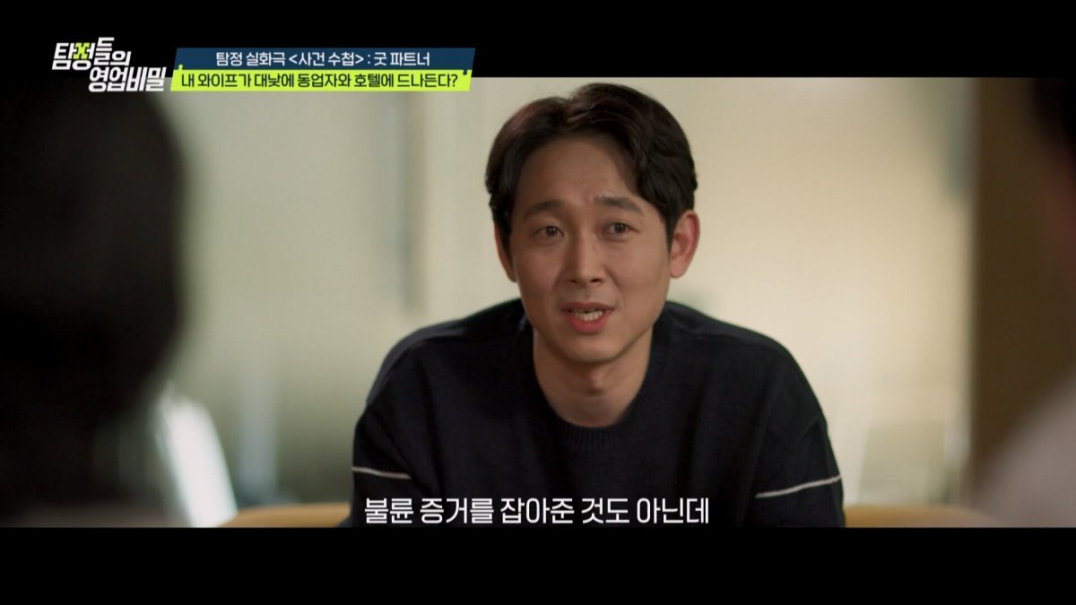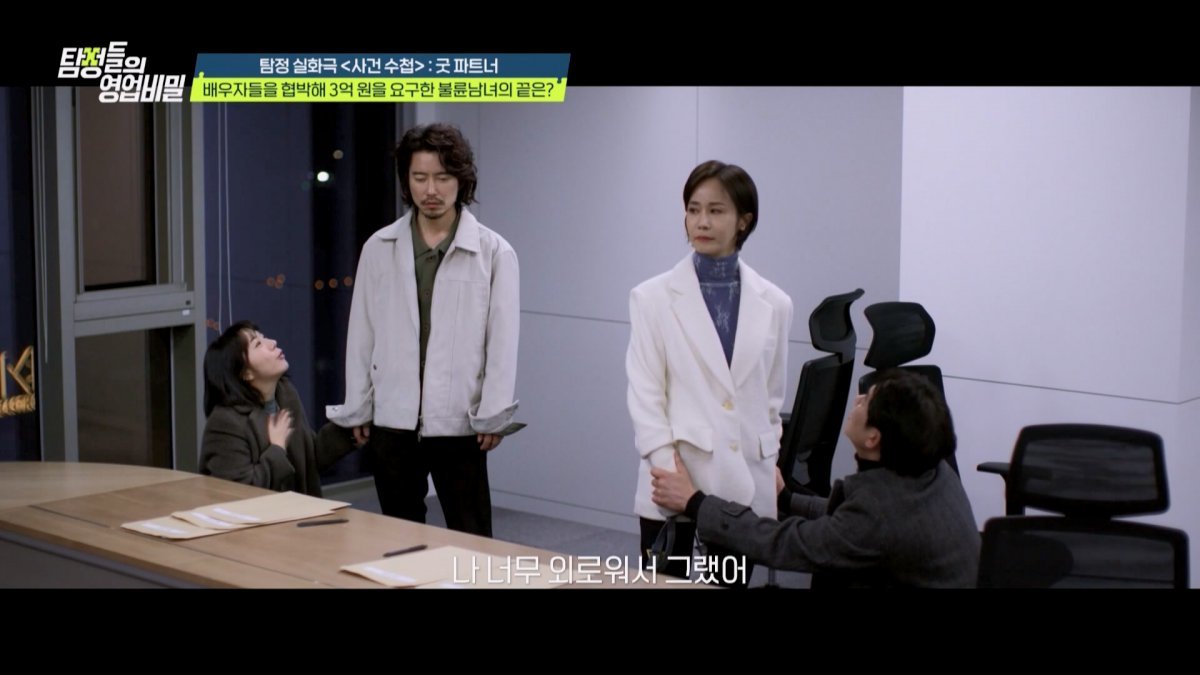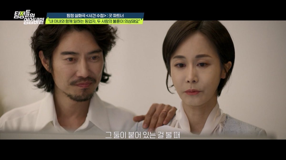 추적 끝에 탐정은 이 협박 메시지를 보낸 이들을 찾아냈다. 놀랍게도 이들은 아내의 불륜을 의심한다던 첫 의뢰인과, 동업자의 아내였다. 두 사람은 부부 동반 모임에서 처음 만난 순간부터 불륜을 시작했다. 서로의 남편과 아내가 잠든 사이 같은 집 안에서 불륜을 저지른 이들의 대담성에 유인나는 “옆 방에 배우자가 있는데도 바람을 피운다고?”라며 충격에 빠졌다. 게다가 두 사람은 도박을 하기 위해 사채에도 손을 대면서 돈이 필요해졌다. 이에 동업 관계인 서로의 배우자들을 불륜으로 몰아 증거를 만들어내려고 했던 것이었다.