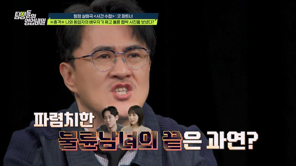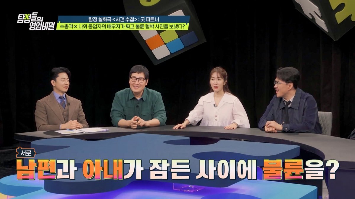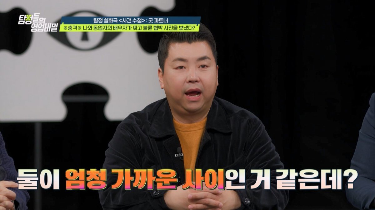 한편, 실화 재구성 코너 ‘사건 수첩-굿 파트너’에는 ‘일식 대가’ 정호영 셰프가 함께했다. 사연 속 의뢰인은 “아내와 아내의 동업자가 불륜 사이인 것 같다”고 의심하며 불륜의 증거를 부탁했다. 아내는 동업자 남성과 제품 개발로 밤낮없이 붙어 있었고, 사업이 성공하자 아내는 더욱 바빠졌다. 반면 같은 시기 의뢰인은 사업 실패로 육아와 집안일을 도맡아 하고 있었다. 때문에 아내의 불륜에 대한 의심도 자격지심인가 싶어, 아내에게 말도 하지 못했다. 의심이 커져가던 가운데, 아내가 침대에서 잠결에 남편이 아닌 동업자의 이름을 부르자 의뢰인은 더욱 고통받았다. 김풍은 “직장 내 불륜이 많다고 하더라. 배우자보다 더 자주 보고 자연스럽게 가까워지니까…”라며 탄식했다.