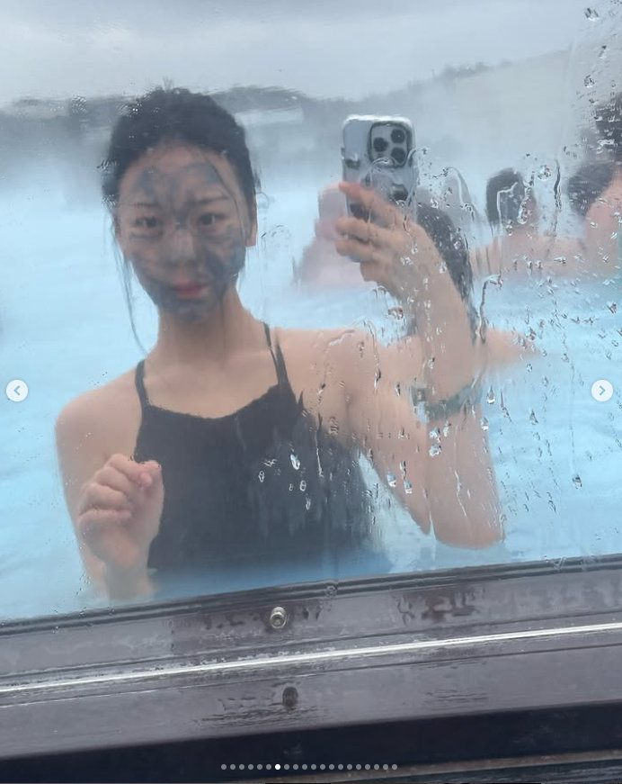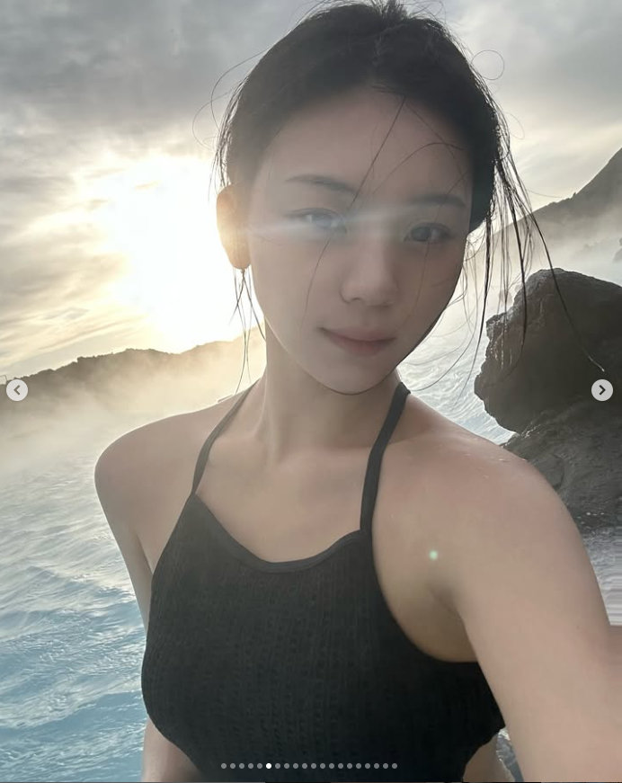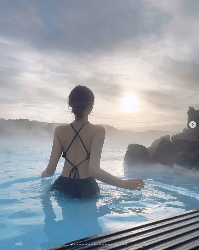 사진 속 엄지는 수영복을 입고 온천욕을 즐기는가 하면 대자연을 만끽하기도 한다. 이국적인 장소에서 카메라를 향해 귀여운 표정을 짓는다. 특유의 귀여움을 다수 여행사진에 담겨 시선을 끈다.