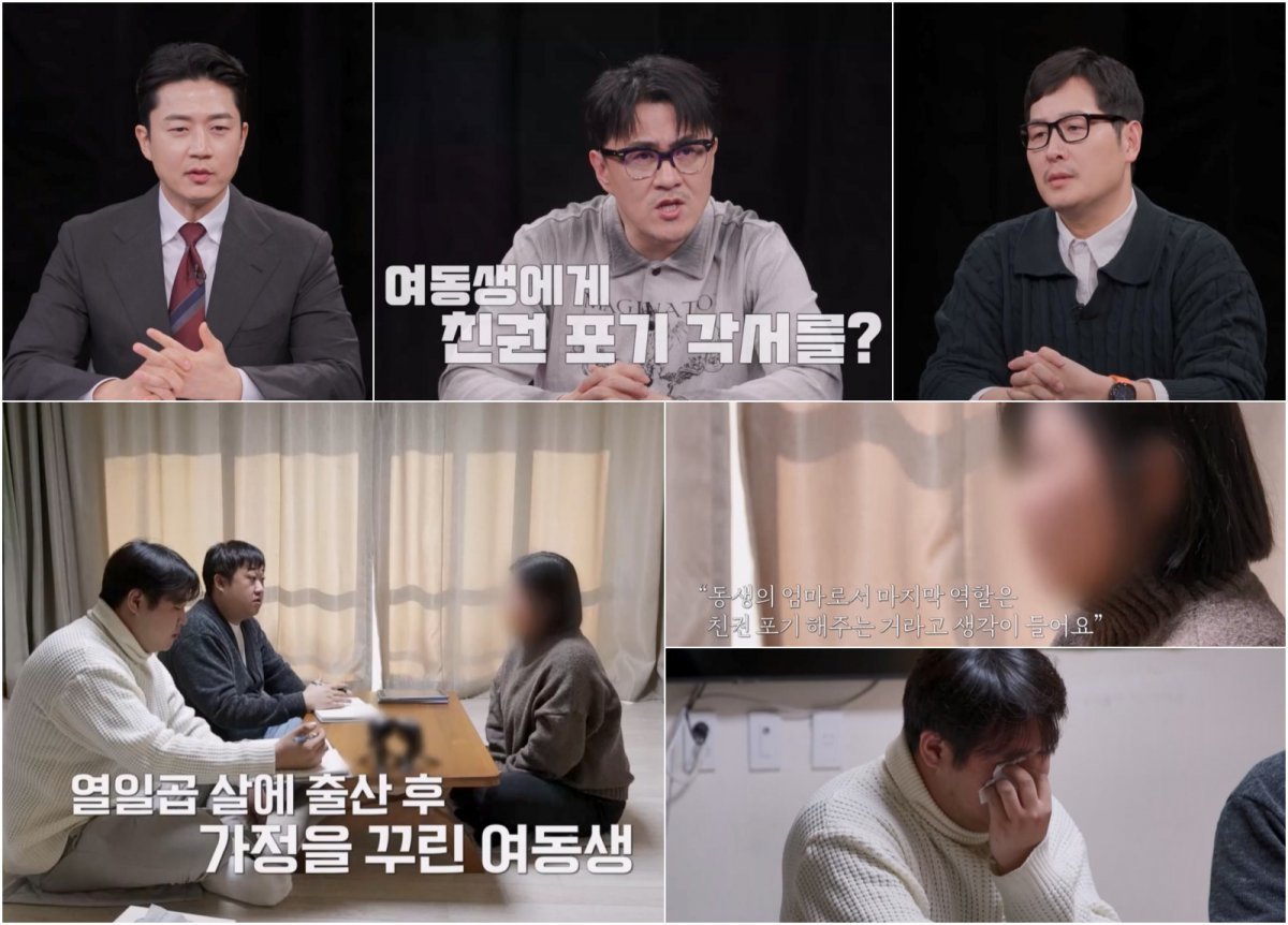그러나 이후 여동생은 ‘아동학대’로 신고를 당했다. 아이들은 친모와 즉시 분리돼 보육원으로 보내져야 했다. 남성태 변호사는 “아동학대 정도에 따라 분리 여부가 판단되는데, 심각한 상황으로 보인다”며 조심스럽게 의견을 밝혔다. 의뢰인은 “동생의 마지막 역할은 친권을 포기해 주는 것이다”라고 전했다. 김풍은 “유일하게 해줄 수 있는 일이 친권 포기라니…가슴 아픈 이야기다”라며 씁쓸해했다.