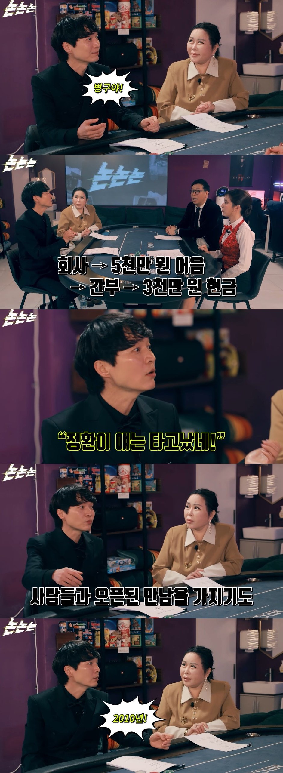 신정환은 “어디서도 이야기한 적이 없다”라며 “회사에서 돈을 어음으로 줬다. 5천만원짜리 어음을 주는데 회사 간부가 그 돈을 현금으로 줬다. 그걸 가지고 생활비로 쓰고 있는데, 쉬는 날 갑자기 형들이 ‘나와봐’라고 했다. 강원랜드가 오픈했다고 했더라”라고 당시를 회상했다.