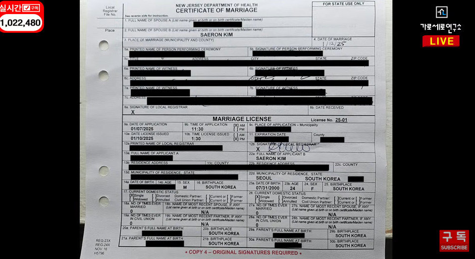 해당 영상에서 자신이 故 김새론의 전남편이라고 주장한 남성은 김새론과의 결혼 증명서를 공개했다. 해당 결혼 증명서에는 ‘SAERON KIM’이라는 김새론의 이름이 적혀있다.