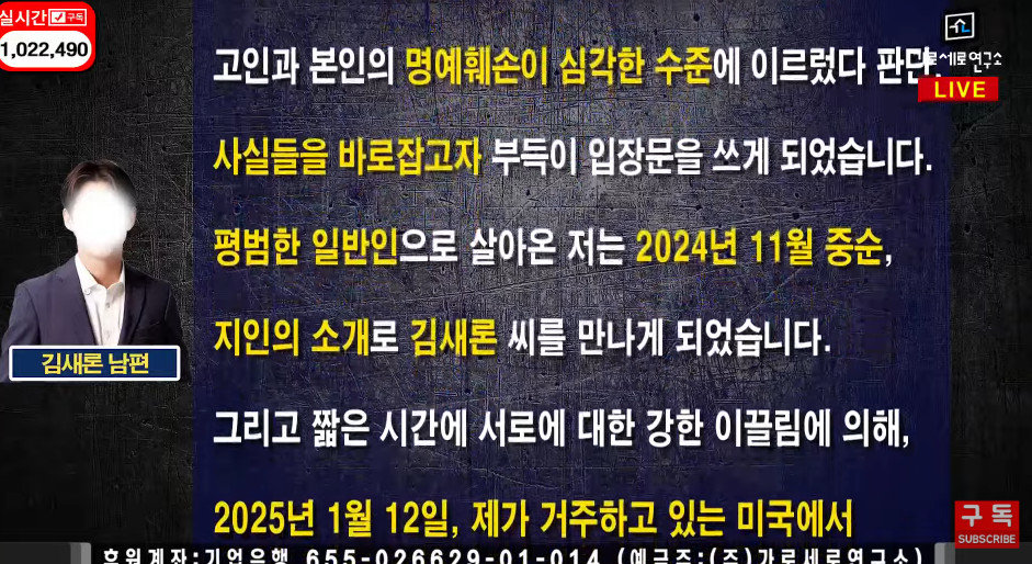 25일 오후 유튜브 채널 ‘가로세로연구소’에는 ‘김새론 남편 입장문 공개’라는 제목의 영상이 공개됐다.