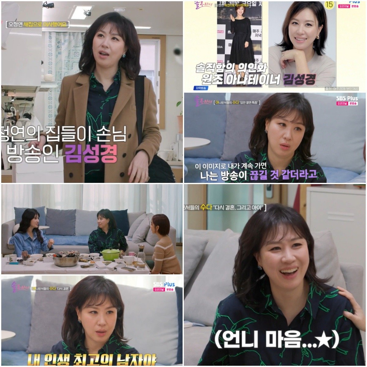 김성경은 8일 방송된 SBS Plus·E채널 예능 ‘솔로라서’ 14회에서 아나운서 후배 오정연의 집들이 손님으로 출연해 화끈한 입담과 진심 어린 조언으로 숨겨진 예능감을 뽐내며 안방극장을 사로잡았다.