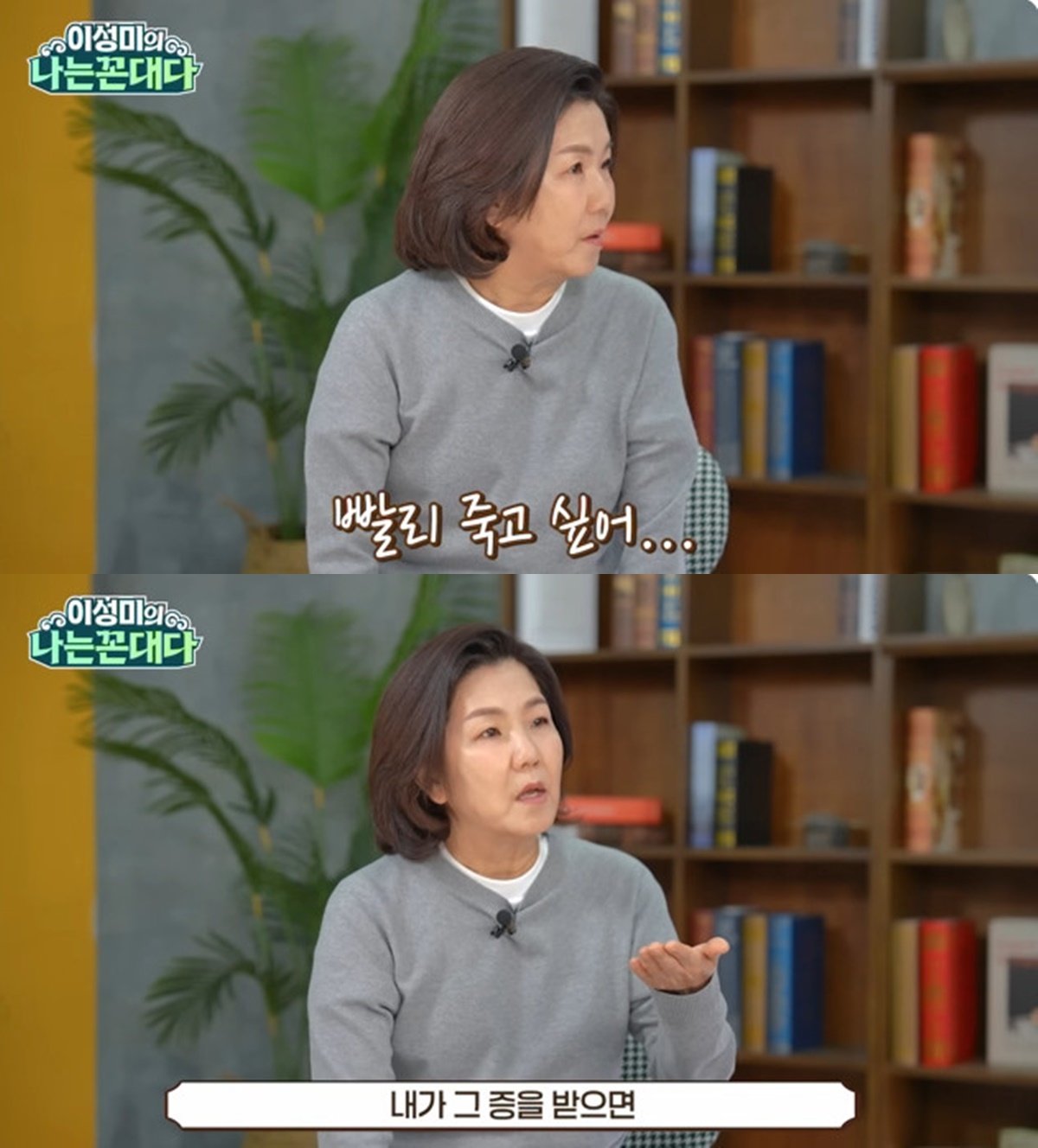 이날 이성미는 “삶에 재미가 없다. 그러면서 방송 보는 분들이 ‘쟤가 저런다고?’ 할 것 같은데 빨리 죽고 싶다. 삶의 의욕이 없다”라고 말했다.