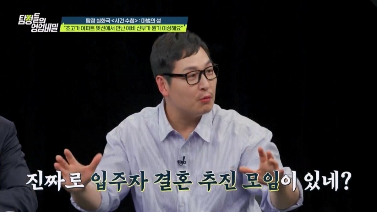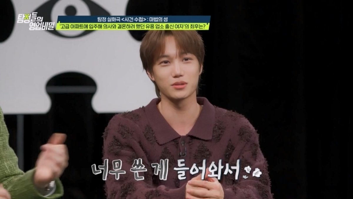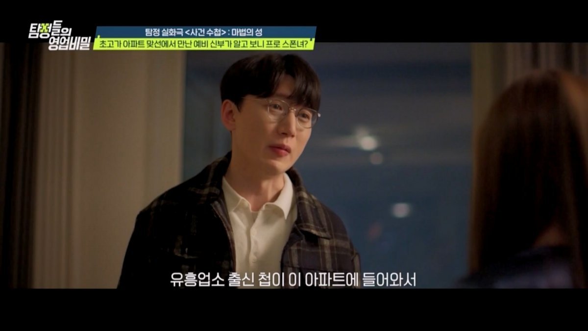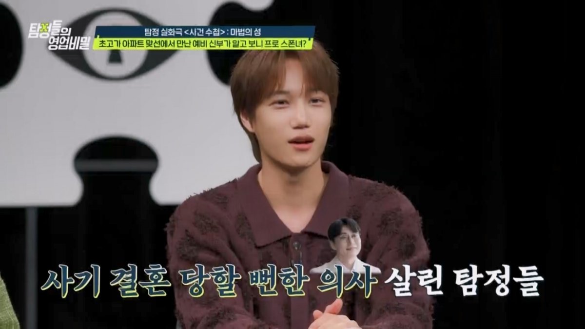 실화 재구성 코너 ‘사건 수첩-마법의 성’에는 엑소 카이가 게스트로 함께했다. 이번 실화 속 탐정사무소에는 부모님과 함께 고급 아파트 단지로 이사 오게 된 의사 의뢰인이 등장했다. 의뢰인은 부모님이 대신 신청한 ‘아파트 단지 내 결혼 추진 모임’에 나가게 됐다가 본인과 비슷한 점이 많은 여자친구와 만났다. 두 사람은 서로에 대한 확신으로 3개월 만에 결혼 준비까지 시작했다. 아버지와 단둘이 살고 있는 예비신부는 “어머니는 동생의 유학 때문에 해외에 살고 있다”고 전했다. 그런데 의뢰인은 예비신부가 아버지와 함께 있을 때 불편해하며 살짝만 아버지와 닿아도 화들짝 놀라는 모습을 목격했다. 또 예비 장인어른이 젊은 여성과 외도를 즐기는 장면도 포착됐다. 결국 의뢰인은 예비신부가 아버지로부터 ‘근친 성폭력’이라도 당하고 있는 건 아닐지 걱정하며 탐정에게 조사를 부탁했다.