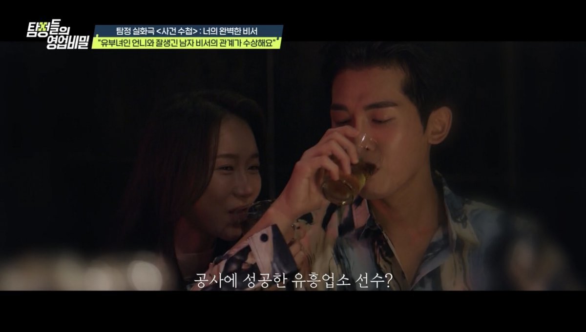 실화 재구성 코너인 ‘사건 수첩’에서는 회사 대표인 유부녀 언니와 잘생긴 남자 비서의 관계가 수상하다는 여동생의 의뢰 내용이 다뤄졌다. 이 남자 비서는 연예인 뺨치는 외모에 명문대 학벌, 화려한 스펙까지 갖춘 그야말로 ‘완벽한 비서’였다. 특히 대표인 언니가 비서에게 아양을 떨고, 주종 관계처럼 보일 정도로 꼼짝을 못한다는 점에서 그의 정체에 대한 추측이 쏟아졌다. 가장 유력했던 건 ‘호스트바 선수’ 출신일 것이라는 추측이었다. 이에 백호 탐정단은 “실제로 회사를 운영하시는 분들이 유흥업소 출신인 사람을 취직시키고, 후원까지 해주는 일이 번번이 일어난다”라고 밝혀 놀라움을 자아냈다.