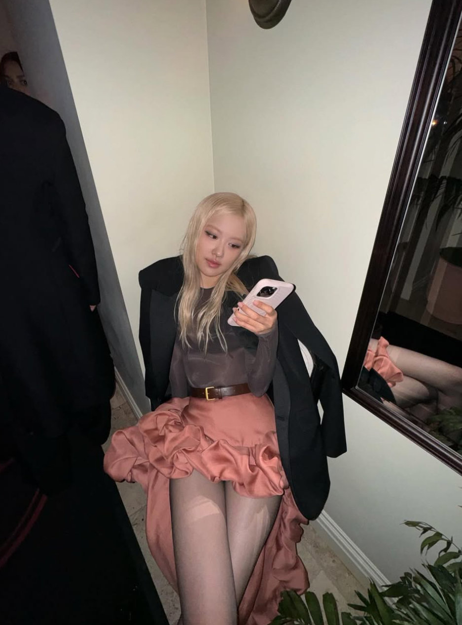 로제는 11일 자신의 인스타그램을 통해 한 행사장에서 멤버 제니와 함께 찍은 사진과 영상을 공개했다. 사진 속 로제는 블랙 언더웨어 위에 시스루 상의와 재킷 그리고 하의로는 벌룬스커트를 매치한 스타일링을 선보였다.