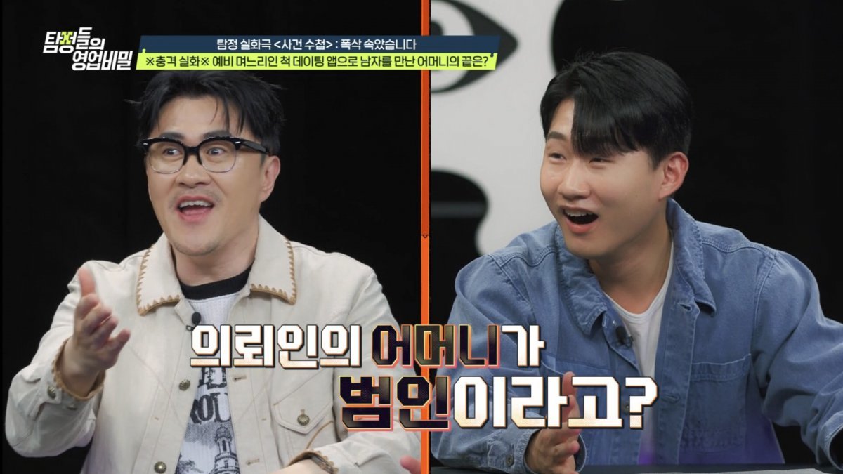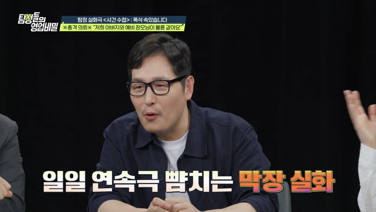 실화 재구성 코너인 ‘사건 수첩’에서는 한 남성이 “아버지와 예비 장모님의 관계가 수상하다”며 탐정단을 찾았다. 어느 날 아버지와 예비 장모가 불 꺼진 사무실에서 은밀하게 만나는 장면을 목격했다는 것이었다. 예비 장모의 “사돈? 그렇게 부르지 말라니까, 오빠”라는 말에 ‘탐정들의 영업비밀’ MC들은 사돈끼리의 불륜 사건임을 확신했다. 실제로 사돈과 불륜을 저지르는 경우가 있냐는 출연자들의 질문에 남성태 변호사는 “과거 불륜 커플이 사돈으로 재회한 경우도 있었다. 자식들 예비 신혼집에서 불륜 행각을 저지르다가 발각됐는데 ‘우리가 너희보다 먼저 만났어’라고 말했다더라”라며 막장 실화를 공개했다. 김풍은 “일일 연속극에서 많이 본 대사”라며 경악했다.