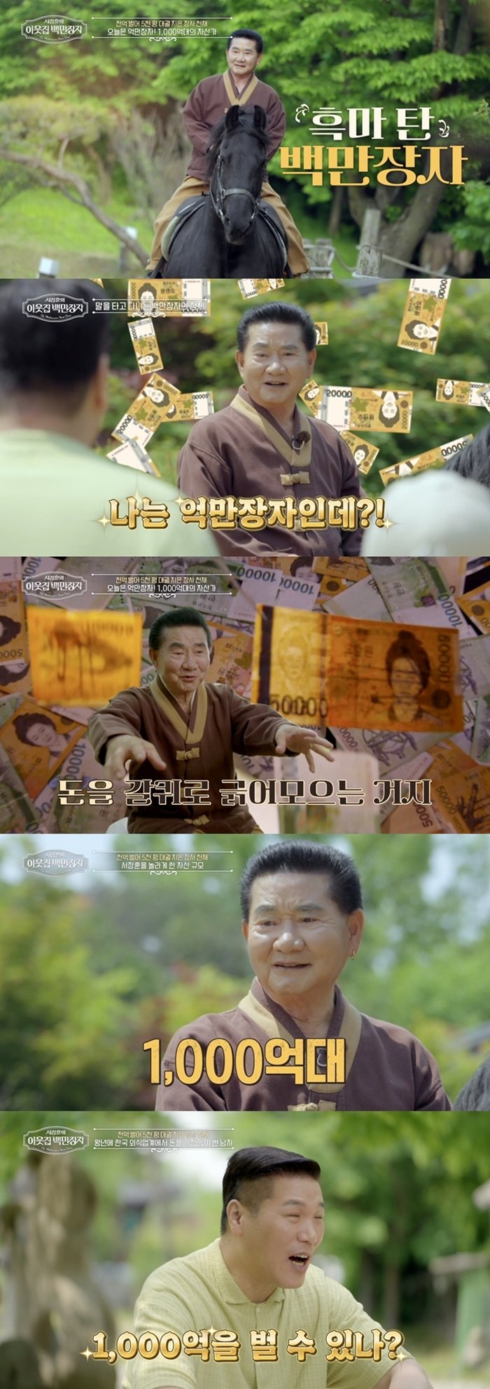 11일 오후 방송되는 EBS, E채널 공동 제작 ‘서장훈의 이웃집 백만장자’(이하 ‘이웃집 백만장자’)에서는 대한민국 요식업계를 평정했던 ‘장사 천재’ 임순형 편이 방송된다. 임순형은 흑마를 타고 도심을 활보하며 ‘이웃집 백만장자’ 역대급 쇼킹한 등장으로 눈길을 끈다. ‘이웃집 백만장자’ 제작진은 “심지어 딸네 집에 갈 때도 말을 타고 간다”라고 귀띔해 놀라움을 자아낸다. 임순형은 서장훈이 “오늘 저희가 만나 뵐 백만장자가 맞으시냐”라고 묻자, “나는 억만장자”라고 대답하며 범상치 않은 아우라를 드러낸다. 이에 서장훈은 임순형에 대해 “한때 우리나라 요식업계에서 돈을 가장 많이 버신 분이라는 소문이 있다”라고 소개해 궁금증을 더한다.