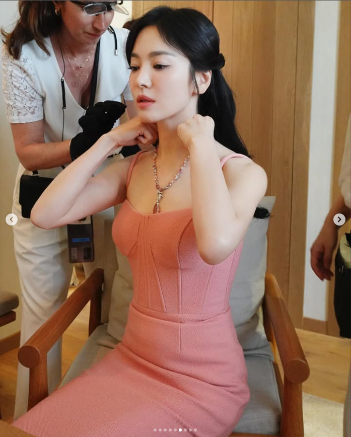 공개된 사진에는 자신이 모델로 있는 브랜드 촬영 차 해외 체류 중인 송혜교 모습이 담긴다. 송혜교는 핑크빛 드레스로 아름다움을 뽐낸다. 빼어난 미모와 드레스에 꼭 맞는 자태는 감탄을 자아낸다. 상황에 맞게 분위기에 맞게 다채로운 포즈도 안성맞춤이다.