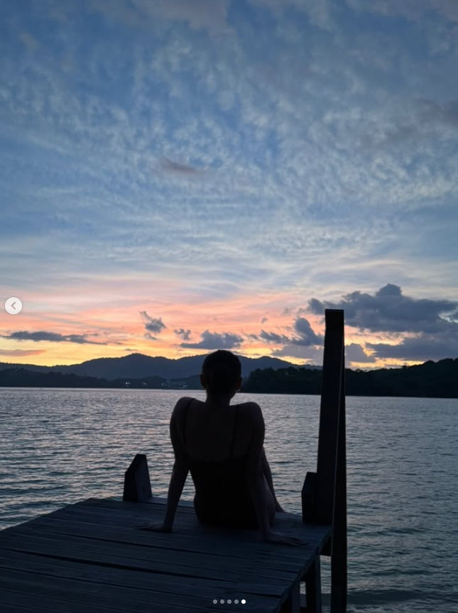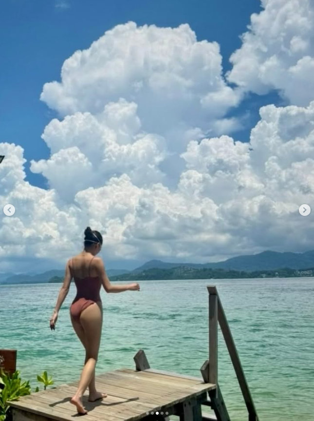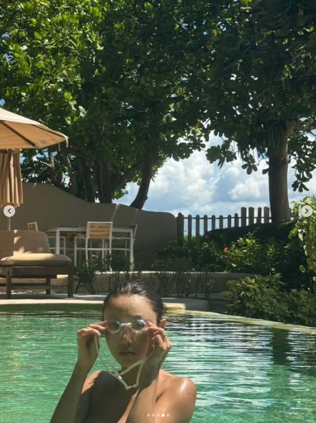 사진 속 화사는 수영복을 입은 채 영자 책을 읽고 있다. 또 수영을 즐기기 위해 바다로 향하는 모습이 시선을 끈다. 수영장에서 포착된 화사는 아찔함 그 자체다. 마치 수영복을 입지 않은 듯하다. 또 노을을 감상하는 화사의 모습이 한가로움을 자아낸다.