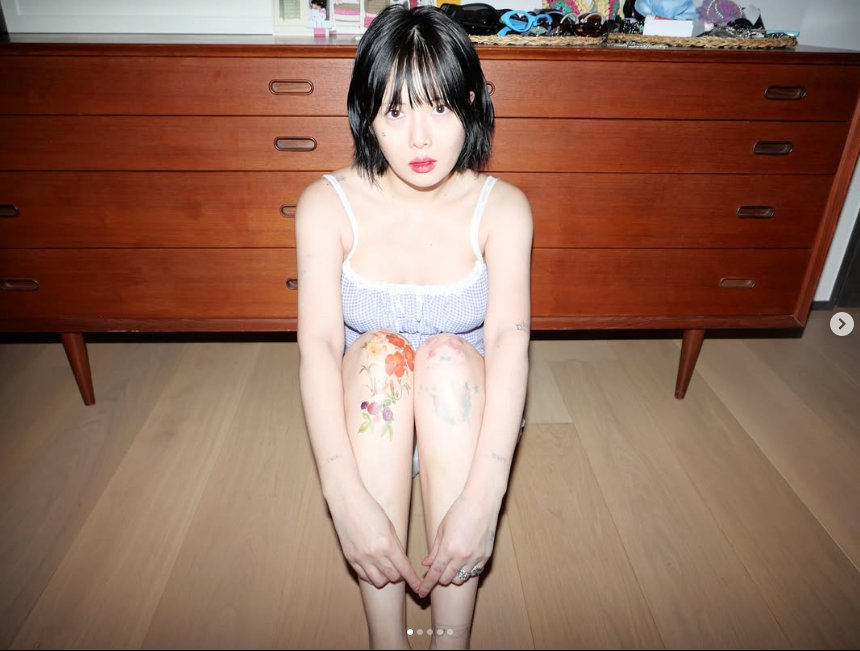 공개된 사진에는 짧은 의상을 입은 채 방바닥에 앉아 포즈를 취하는 현아 모습이 담긴다. 파격적인 무릎 타투와 달리 얼굴 메이크업은 청초하다. 짙은 화장보다 수수함에 가깝다. 군살 하나 없는 현아는 여전하다.