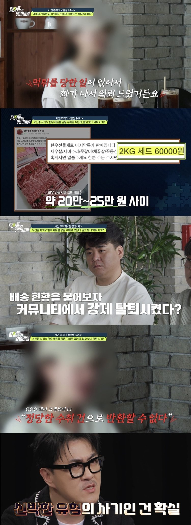 4일 오후 방송되는 채널A ‘탐정들의 영업비밀’에서는 공구(공동 구매) 커뮤니티 ‘먹튀 사기’ 피해를 호소하는 의뢰인이 올빼미 탐정단을 찾아온다. 의뢰인은 한 온라인 공구 커뮤니티에서 시중 판매가 20~25만 원 상당의 ‘한우 선물세트 2kg을 저렴하게 판매한다’는 글을 보고 대금 6만 원을 입금했다고 했다. 회원 수가 적지 않은 데다가 잘 먹었다는 후기도 많아 의심은 하지 않았다고 했다. 판매자는 의뢰인이 한우 실물 사진을 요청하자 곧바로 보내주며 안심시키기도 했다.