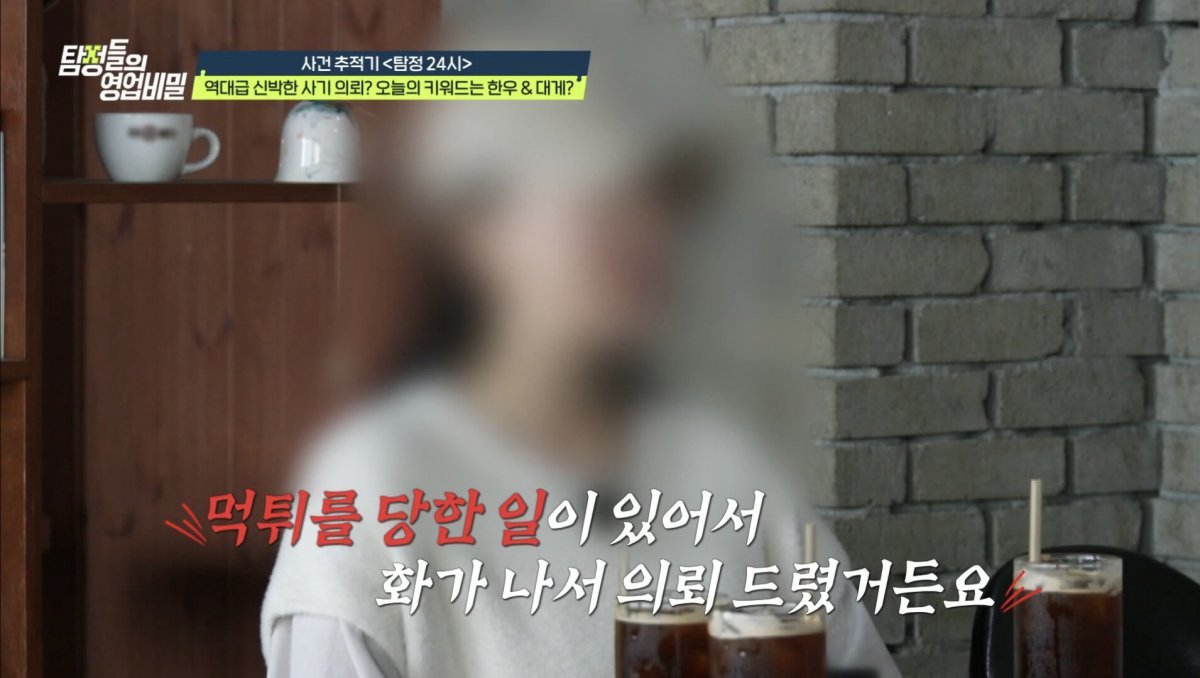 지난 4일 채널A ‘탐정들의 영업비밀’ 속 ‘탐정 24시’에서는 회원 수 약 700명의 온라인 공구 커뮤니티에서 일어난 신종 사기 사건에 대해 다뤘다. 의뢰인은 시중 판매가 20~25만 원 상당의 한우 선물세트 2kg을 6만 원에 저렴하게 판매한다는 글을 보고 바로 입금을 했다. 그러나 기다려도 택배가 오지 않아 배송 문의를 하자, 돌아온 것은 커뮤니티 강제 탈퇴와 차단이었다. 은행에 “돈을 잘못 송금했으니 돌려달라”라고 요청했으나, “정당 수취 건으로 반환 신청이 거부됐다”라는 답변이 돌아왔다. 알고 보니 의뢰인이 입금한 곳은 한 숙박업소의 계좌였다. 사기꾼이 의뢰인에게 사기를 쳐서 자신이 투숙 중인 모텔의 숙박비를 대신 입금하게 한 것이었다.