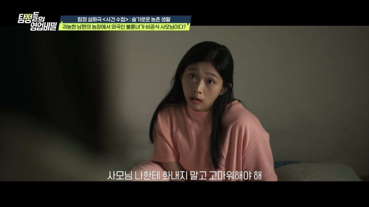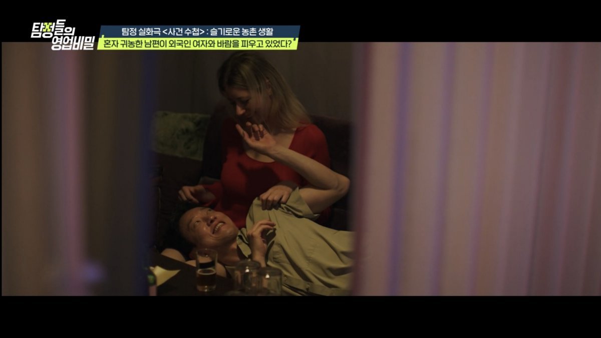 어반자카파 조현아가 일일 탐정으로 함께한 탐정 실화극 ‘사건 수첩’에는 “귀농한 남편이 바람을 피우는 것 같다”라는 여성 의뢰인이 등장했다. 귀농한 남편과 주말 부부로 살고 있었던 의뢰인은 어느 날 남편의 나체 사진을 SNS로 보게 됐다. 탐정단의 조사 결과 남편은 읍내 유흥주점에서 일하는 외국인 무용수와 불륜을 저지르고 있었던 것으로 드러났다. 해당 불륜녀를 불법 취업으로 신고해 우리나라에서 추방시켰지만, 남편에게는 또 다른 외국인 내연녀가 있었다. 바로 시어머니 소유의 농장에서 남편과 함께 일하는 관리반장으로, 일꾼들 사이에서는 이미 ‘사모님’으로 불리고 있었다.