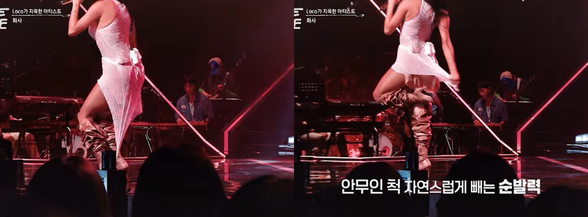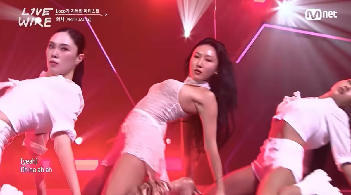 화사는 지난 8일 방송된 Mnet ‘라이브 와이어’에서 ‘마리아’를 열창했다. 이날 누드톤의 의상을 입고 무대에 오른 화사는 ‘무대 장인’ 답게 뛰어난 라이브 실력과 화려한 퍼포먼스를 선보였다. 앉았다 일어나는 과정에서 구두 굽에 치마가 걸려 다소 아찔한 상황이 발생했으나 안무인 척 자연스럽게 빼내 눈길을 끌었다.