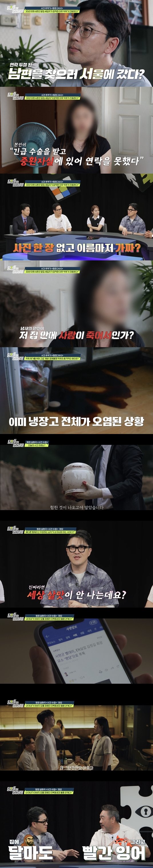 지난 18일 방송된 채널A ‘탐정들의 영업비밀’ 속 ‘탐정 24시’에서는 “올해 5월부터 약 3개월 동안 눈, 코가 따가울 정도의 지독한 악취에 시달리고 있다”는 의뢰인이 등장했다. 현장을 찾았던 백호 탐정단은 악취에 대해 “음식물 쓰레기통의 몇 배로 심각한 수준”이라고 설명했다. 악취의 근원지인 앞집 세입자는 올해 2월 “연락 두절된 남편을 찾으러 서울에 간다”며 떠났다. 이후 세입자는 “제가 긴급 수술을 받고 중환자실에 있다”는 연락을 끝으로 행방이 묘연한 상태였다. 그리고 6월경, 의뢰인의 딸이 세입자와 어렵게 전화 연결에 성공했지만 “아무런 대답 없이 개 짖는 소리만 났다”고 전해 의문을 더했다. 더욱 이상한 점은, 의뢰인이 30년 동안 알던 세입자의 이름이 가짜였다는 것이다. 또 이 세입자는 사진 찍는 것을 극도로 싫어해 단 한 장의 사진도 남기지 않은 것으로 드러났다.